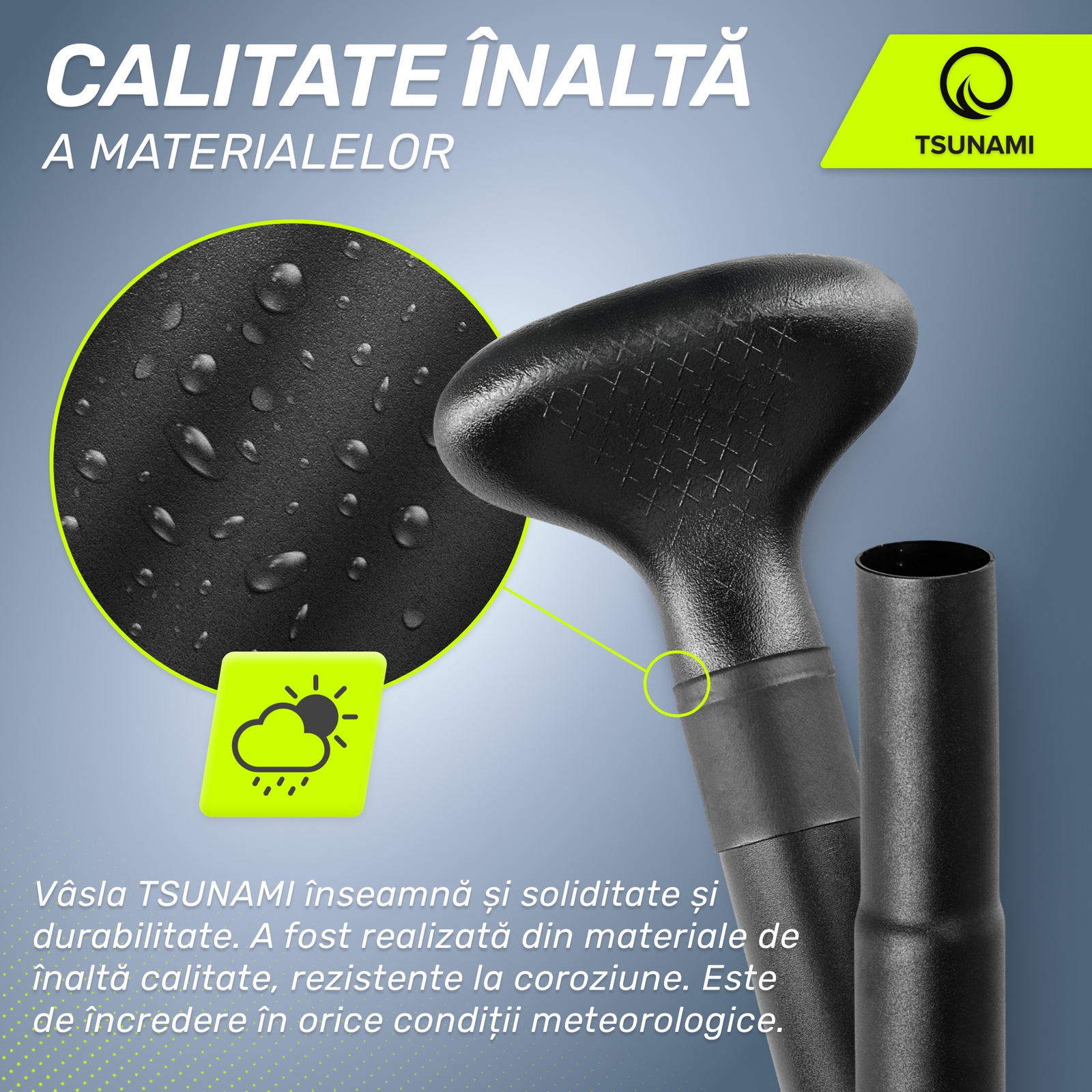 Paleta TSUNAMI reprezintă, de asemenea, robustețe și durabilitate. Este fabricată din materiale de înaltă calitate, rezistente la coroziune. Vâsla SUP este fiabilă în toate condițiile meteorologice. Mânerele antiderapante garantează o prindere sigură în orice situație, făcând în același timp vâslitul confortabil. Construcția robustă, care este rezistentă la deteriorări mecanice, este un lucru care va fi apreciat de oricine dorește să fie sigur că vâsla nu se va defecta atunci când se așteaptă mai puțin și va dura multe sezoane. Cu TSUNAMI, fiecare expediție pe apă este plăcere pură, fără să vă faceți griji cu privire la durabilitatea echipamentului.