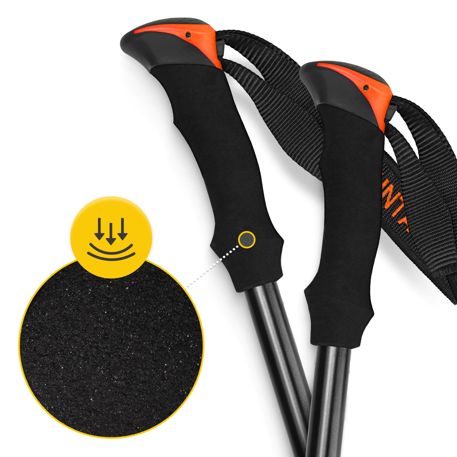 Bețele de trekking PEAK+ sunt alegerea ideală pentru cei care apreciază calitatea superioară și execuția profesională. Realizate dintr-un aliaj durabil de aluminiu 7075, bastoanele sunt extrem de ușoare și nu vor fi o povară în timpul drumețiilor lungi. Mai mult, mânerele prelungite sunt confecționate din spumă EVA antiderapantă, astfel prevenind atât alunecarea mâinilor, cât și apariția iritațiilor. Forma ergonomică a mânerelor asigură o prindere fermă și sigură.