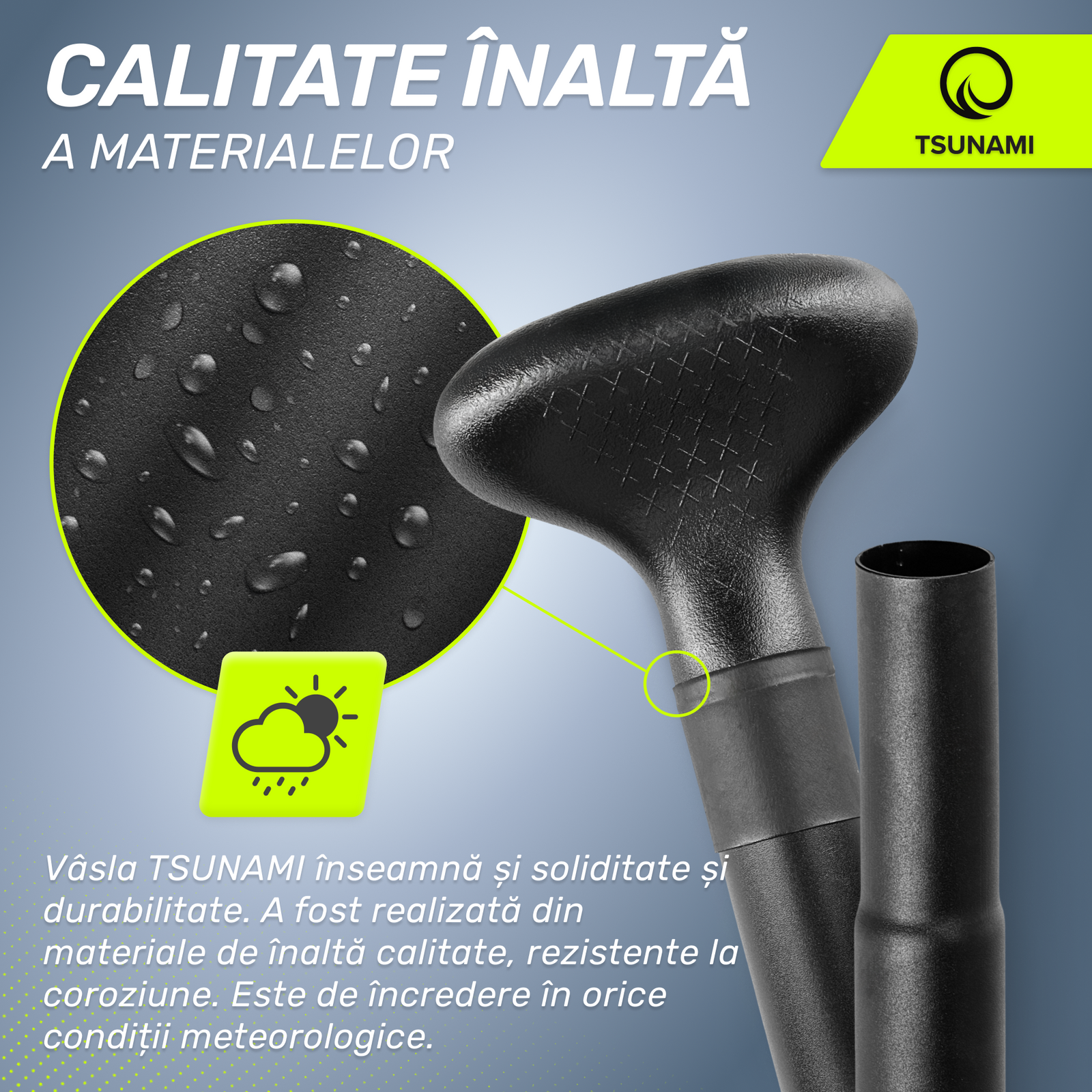 Paleta TSUNAMI este, de asemenea, sinonimă cu robustețea și durabilitatea. Este fabricată din materiale de înaltă calitate, rezistente la coroziune. Vâsla SUP este fiabilă în toate condițiile meteorologice. Mânerul antiderapant garantează o prindere sigură în orice situație, făcând în același timp vâslitul confortabil. Construcția robustă, rezistentă la deteriorări mecanice, este ceva ce toată lumea va aprecia. Cu paleta TSUNAMI, puteți fi sigur că echipamentul nu se va defecta atunci când vă așteptați mai puțin și va dura multe sezoane.