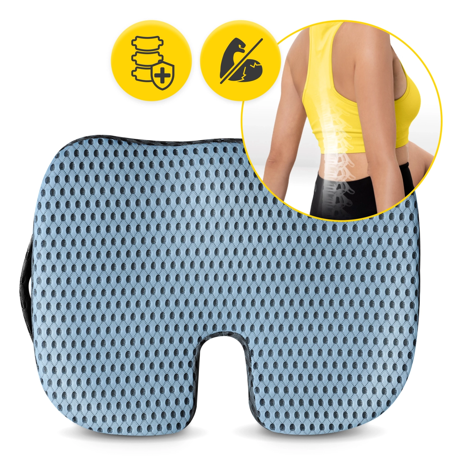Perna de scaun pentru coloana lombară are o formă ergonomică. Se adaptează perfect la forma feselor și a coapselor. Spațiul liber pentru coccisa va funcționa bine pentru persoanele cu hemoroizi. Datorită formei sale ergonomice, perna ușurează presiunea asupra coloanei vertebrale și reduce riscul de iritații. În plus, datorită structurii sale, perna este excelentă la absorbția șocurilor. Aceasta poate reduce tensiunea, care este una dintre cele mai frecvente cauze ale durerilor de spate, inclusiv durerile lombare.