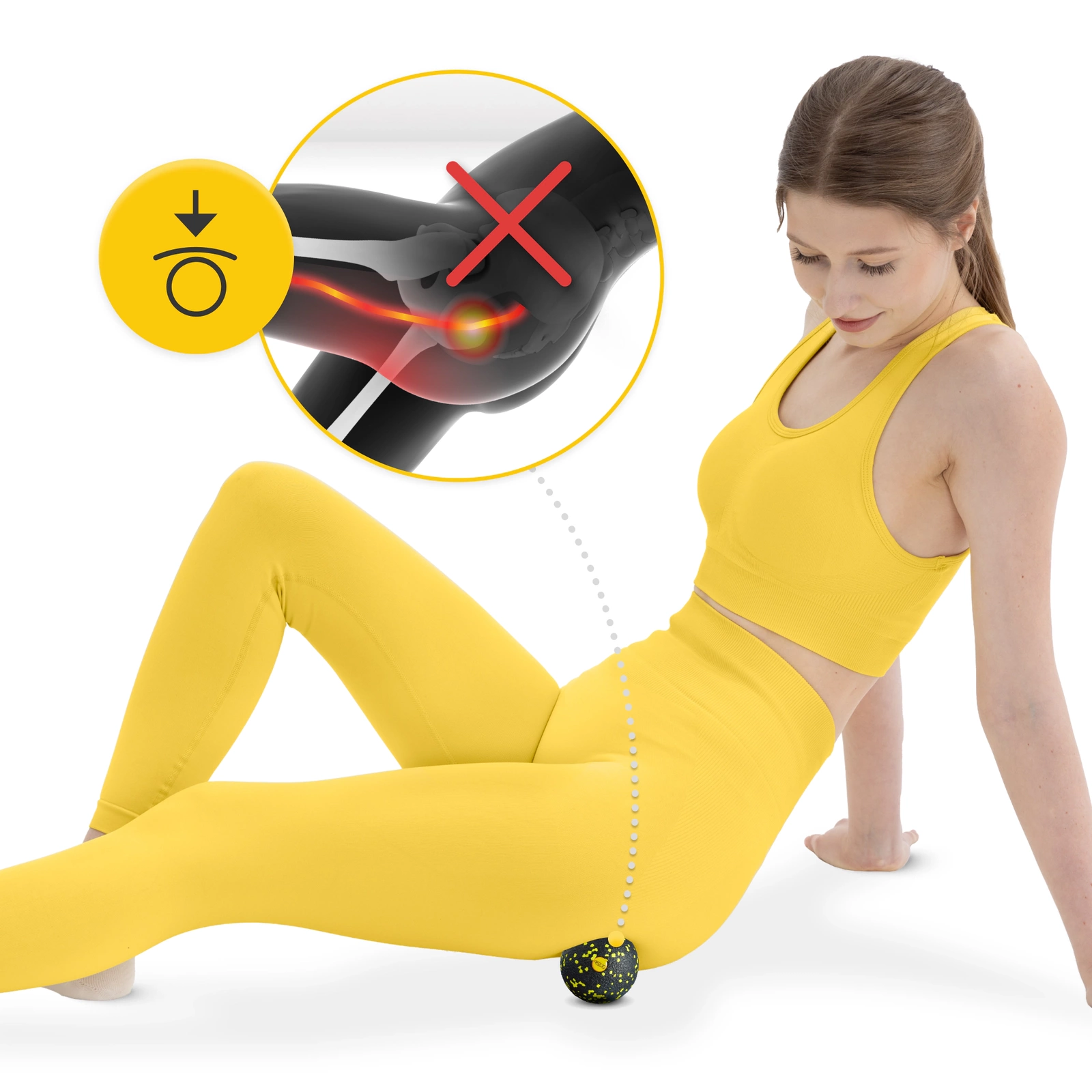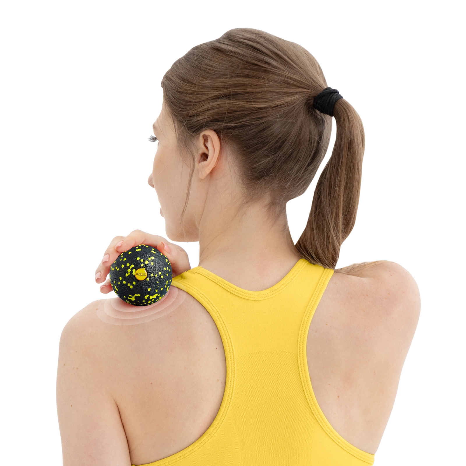 1. Ameliorarea statică a punctelor trigger – aplicați mingea pe zona dureroasă și creșteți treptat presiunea. Continuați să mențineți presiunea până când simțiți că tensiunea musculară scade.