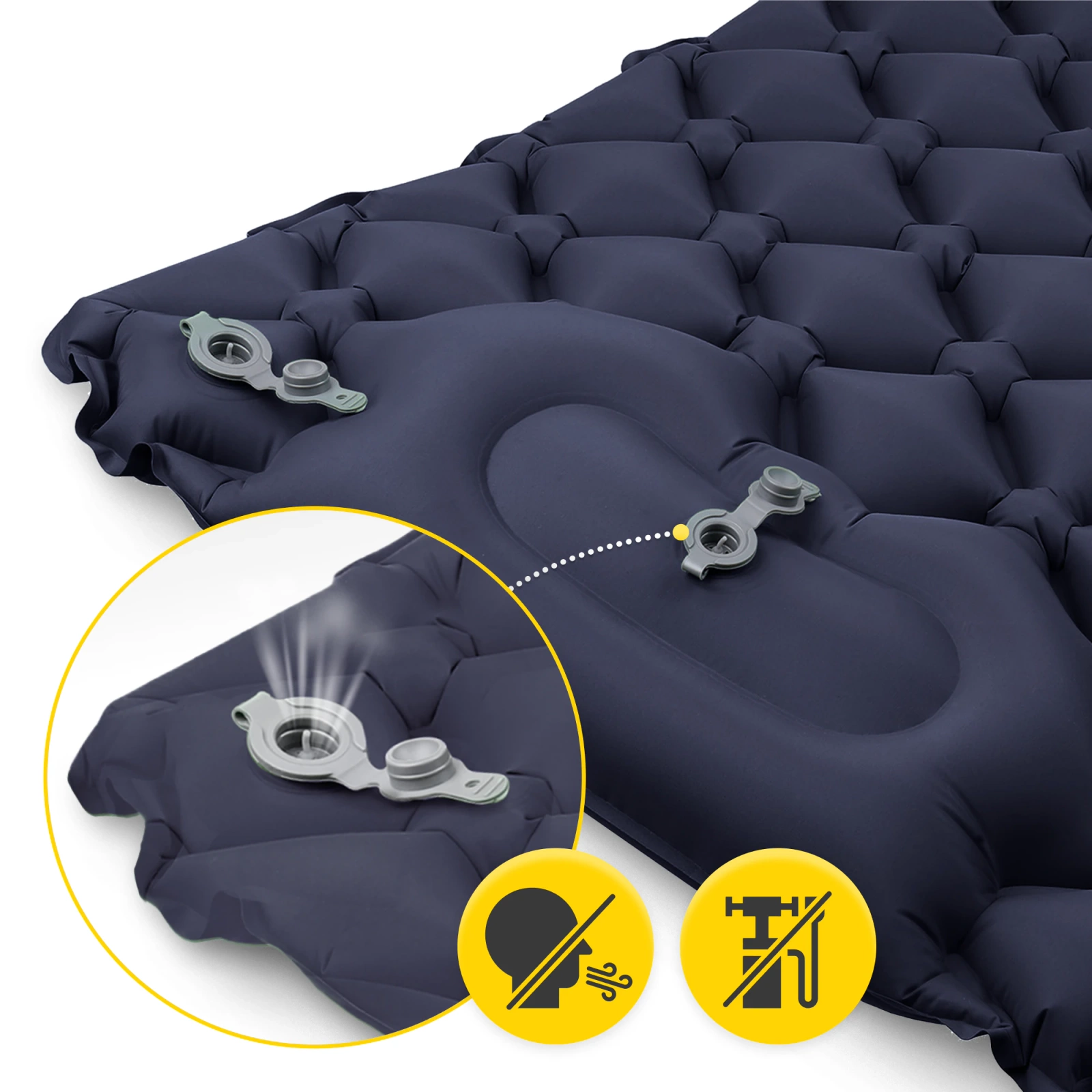 Umflă salteaua gonflabila ultrausoară cu pompa încorporată prin apăsarea acesteia. Poți folosi, de asemenea, o pompă obișnuită (nu este inclusă). Saltea de camping gonflabilă 3 în 1 - confort, comoditate și ergonomie