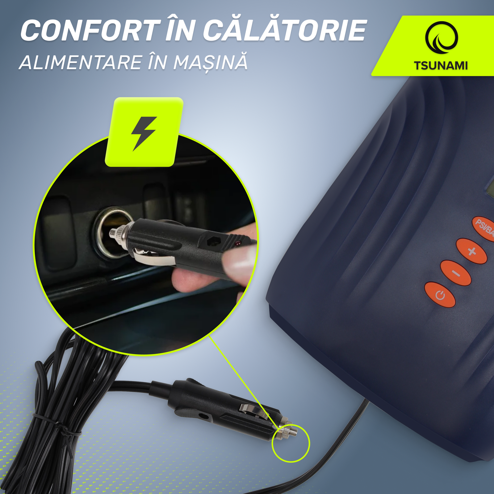 Pompa de înaltă performanță TSUNAMI pentru placa de SUP are dimensiuni compacte. <Este alimentată de o priză clasică de mașină. Are o priză de brichetă pentru 12 volți. Prin urmare, este o opțiune excelentă pentru cei care călătoresc cu mașina, rulota sau furgoneta. Cablul lung vă va permite să vă umpleți placa SUP cu ușurință, în timp ce mânerul ergonomic va face pompa ușor de transportat și transportat.
