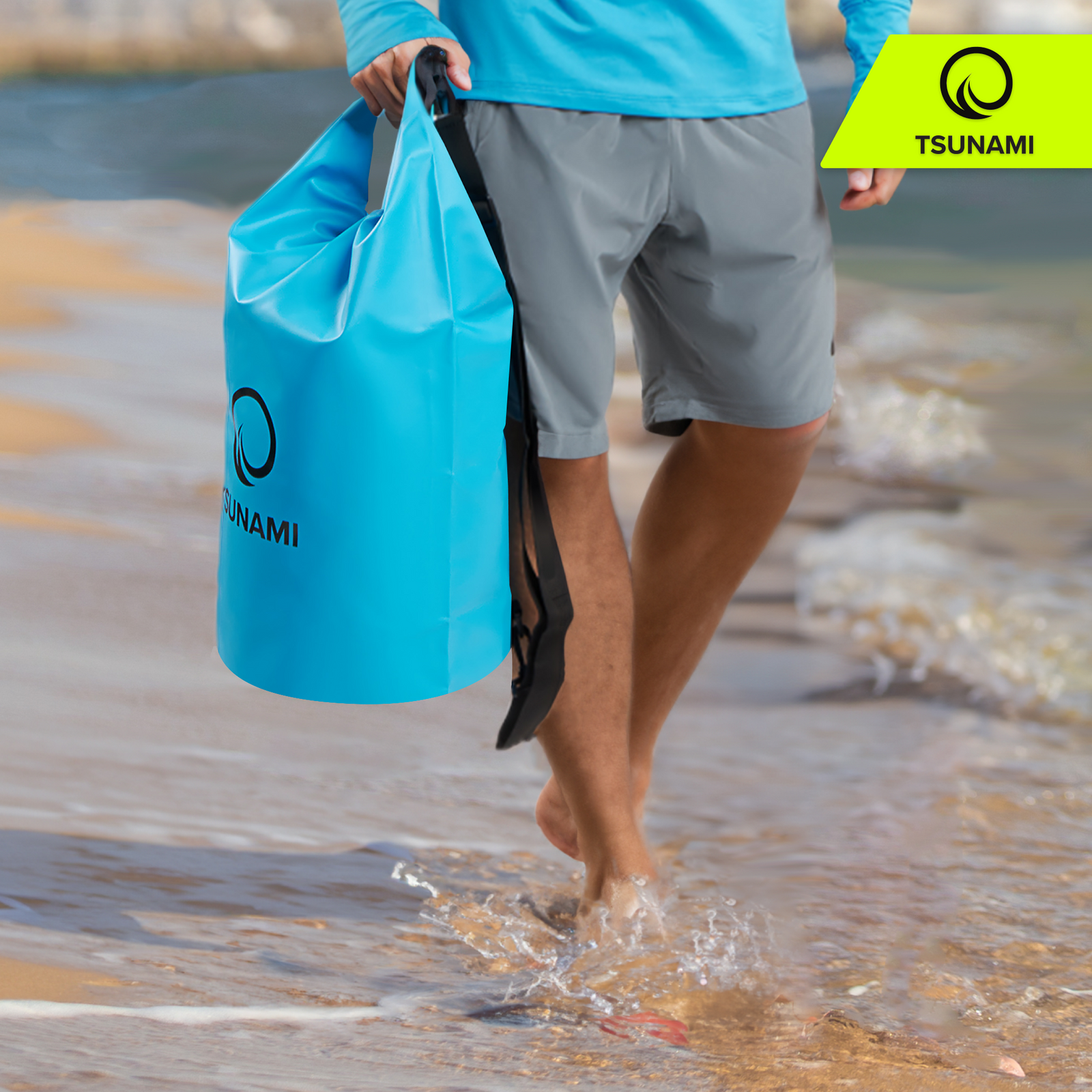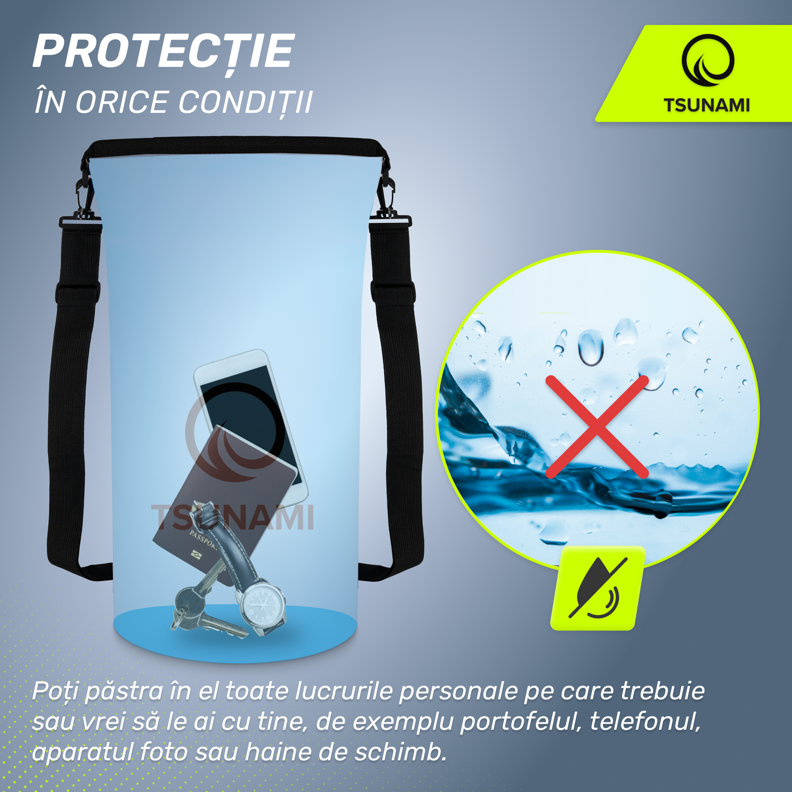Deși este conceput în principal pentru sporturi nautice, sacul impermeabil TSUNAMI este util în orice situație în care obiectele tale ar putea intra în contact cu apa. Este perfect pentru navigație, caiac, SUP, plajă, scufundări și rafting. Îți permite să depozitezi toate obiectele esențiale, cum ar fi portofelul, telefonul, aparatul foto sau hainele de schimb.