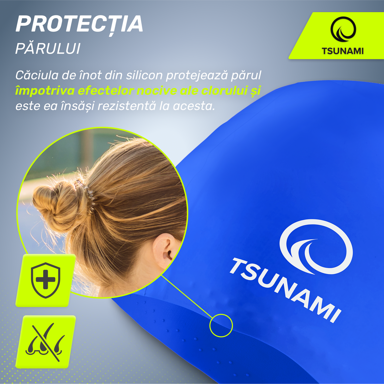 ✅ Silicon durabil și hipoalergenic - materialul protejează părul de efectele adverse ale clorului, fiind în același timp rezistent la clorul însuși, ceea ce face ca casca de înot să fie durabilă chiar și în cazul utilizării frecvente.