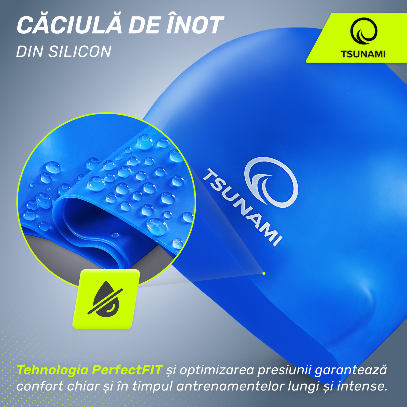 Cască de înot din silicon cu tehnologie PerfectFIT TSUNAMI
