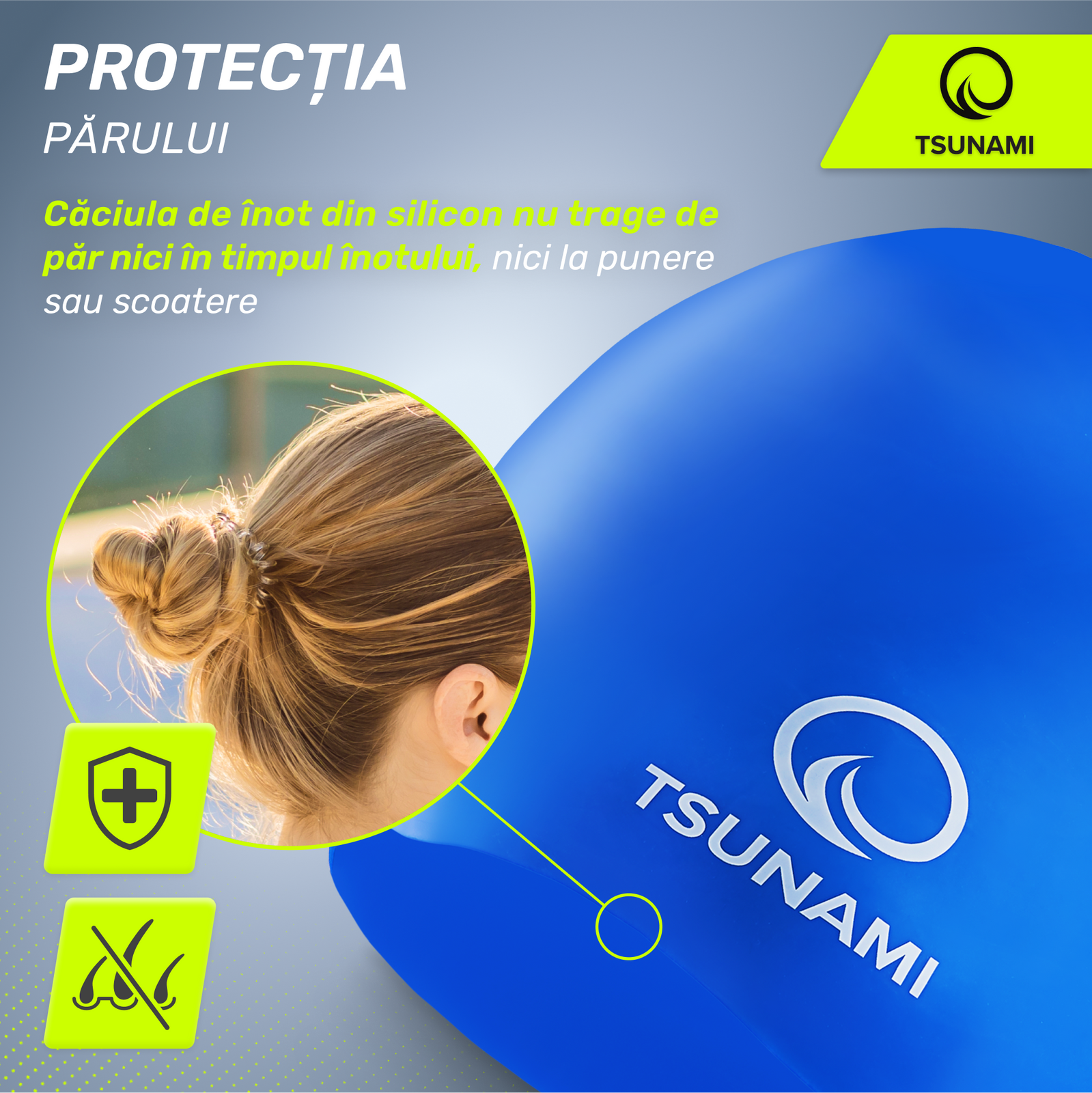 ✅ Siliconul durabil și hipoalergenic protejează părul de efectele dăunătoare ale clorului, fiind în același timp rezistent la clor în sine, ceea ce face că casca de înot să fie durabilă chiar și în cazul utilizării frecvente și intensive.