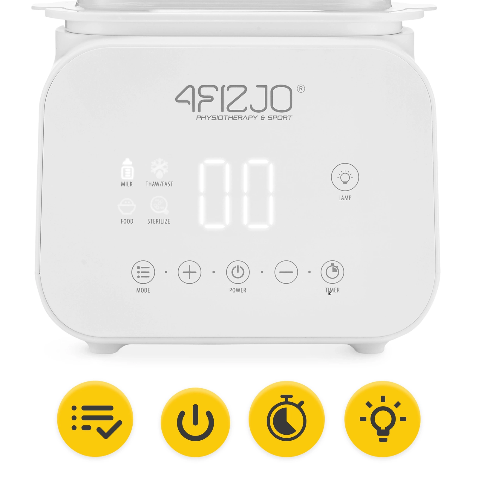 Încălzitorul de biberoane dublu cu sterilizator 4FIZJO este un model intuitiv și ușor de utilizat, cu o funcție 4 în 1. Primele două moduri sunt încălzirea laptelui și a alimentelor. A treia funcție este dezghețarea, care asigură dezghețarea treptată fără a pierde vitaminele valoroase. La rândul său, al patrulea mod este sterilizarea. Aceasta ajută la menținerea igienei corespunzătoare a accesoriilor pentru bebeluși. Această funcționalitate extinsă va permite să personalizați setările după cum este necesar.