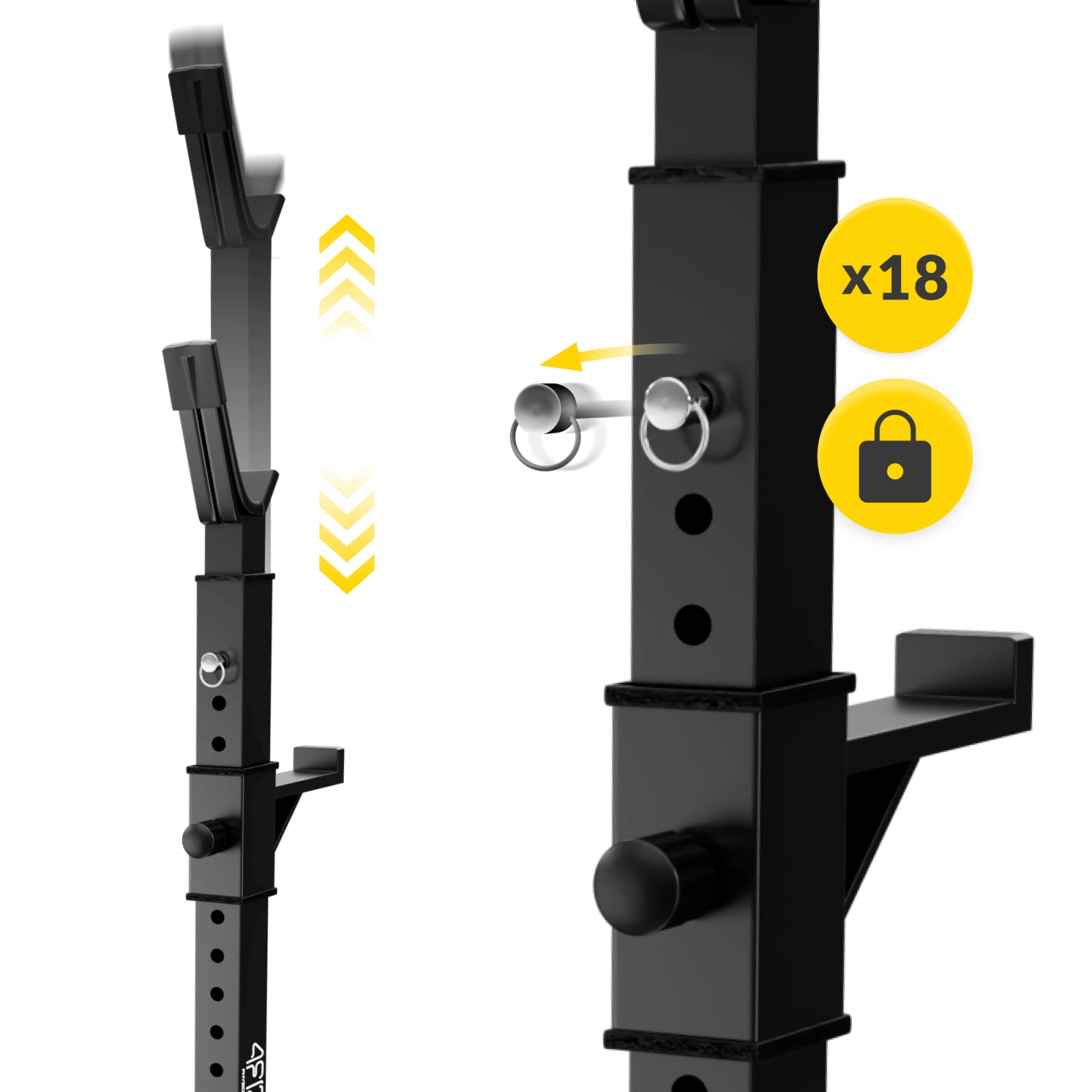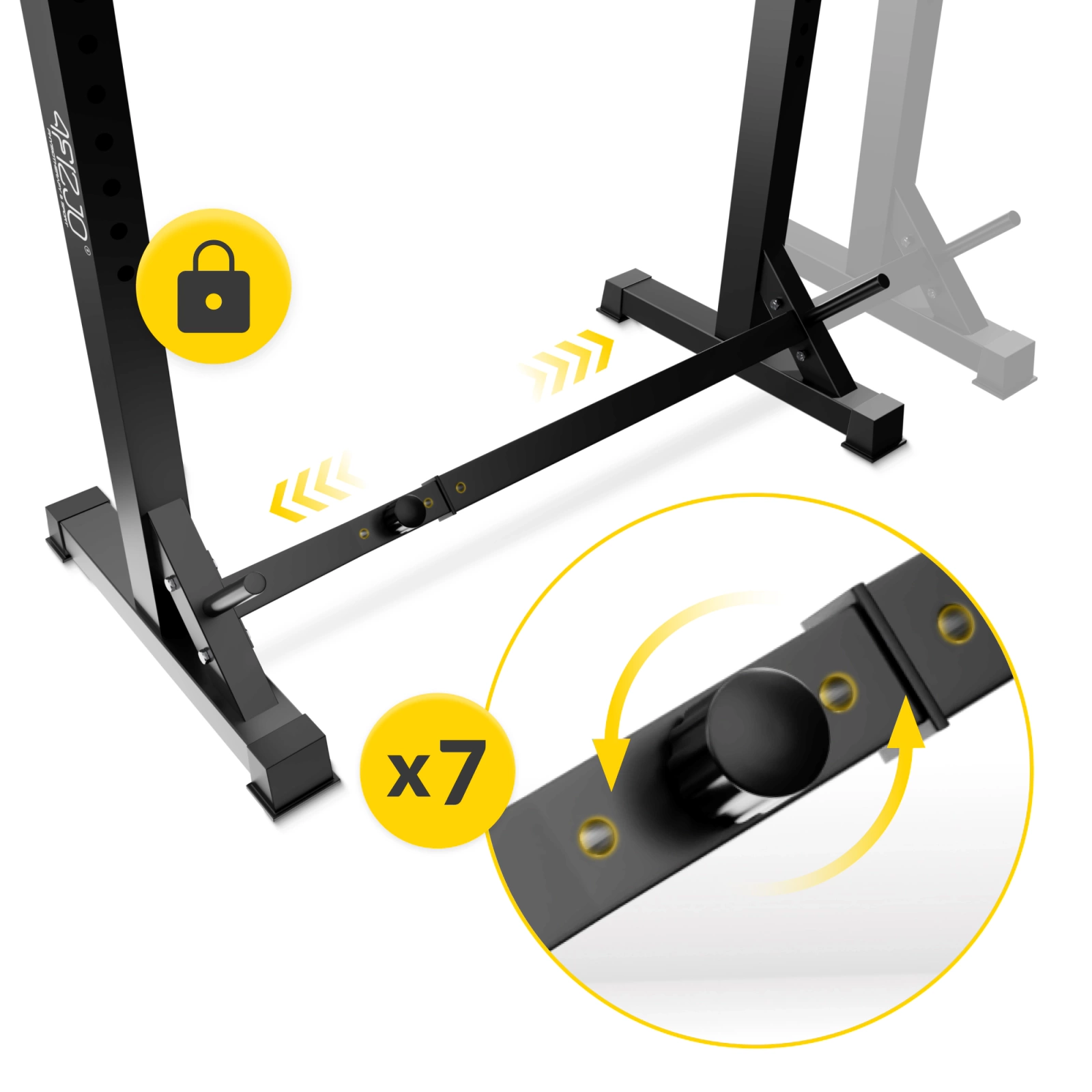 Când te antrenezi la sală, apreciezi faptul că toate echipamentele de acolo pot fi ușor ajustate în funcție de nevoile tale. Dacă da, avem vești bune pentru tine; rafturile pentru haltere PRO oferă o gamă largă de reglaje atât pentru înălțime, cât și pentru lățimea spațiului. Să începem cu înălțimea, pe care o vei seta în 12 niveluri. O vei regla nu numai pentru apăsarea pe bancă, ci și pentru picioare. Mai mult, reglarea distanței în 6 poziții va permite să potrivești lățimea cu întinderea umerilor tăi și să te antrenezi cu o varietate de sarcini. Și cine a spus că un antrenament profesionist poate fi făcut doar în sala de sport?