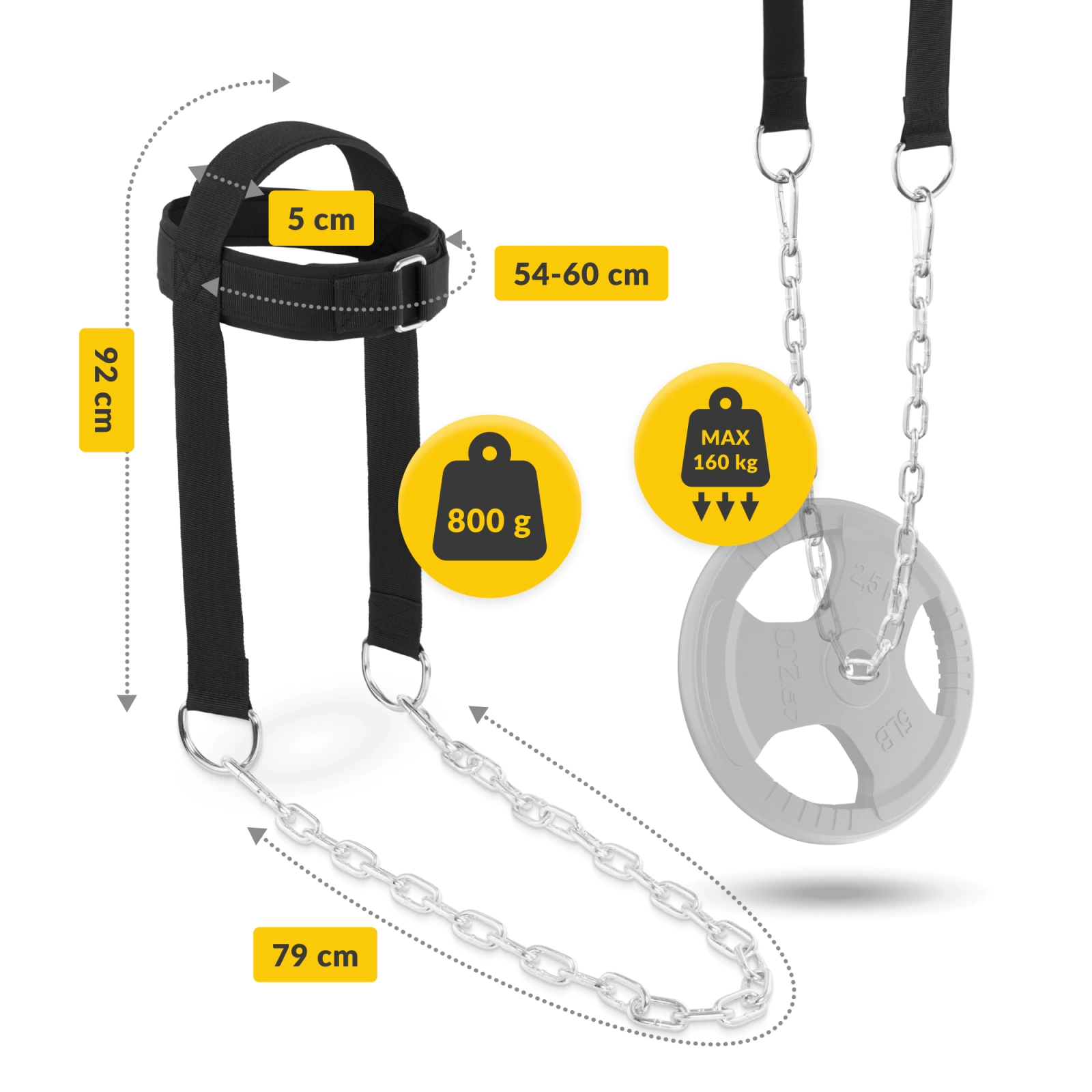 Centura pentru exerciții de gât 4FIZJO este o centură tip ham care se poartă pe cap. Designul acesteia include un sistem de benzi reglabile conectate între ele, care se prind cu velcro. În plus, benzile sunt fabricate din materiale durabile și de înaltă calitate – nylon și neopren. Acest lucru asigură o potrivire corectă, confort în purtare și siguranță în timpul antrenamentului. Astfel, persoana care se antrenează evită iritațiile neplăcute, tăieturile și accidentările. Hamul pentru gât 4FIZJO este echipat cu un lanț din oțel robust. Acesta permite suspendarea unei încărcături mari de până la 160 kg, fără a pierde controlul asupra greutății.