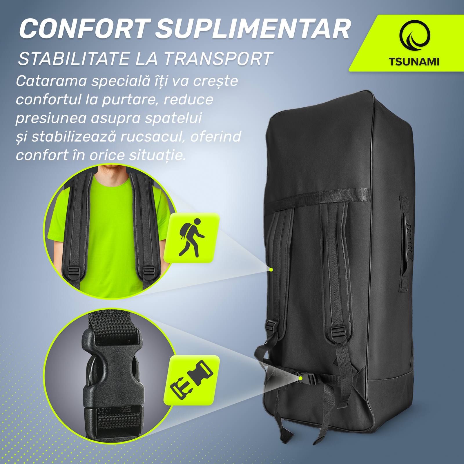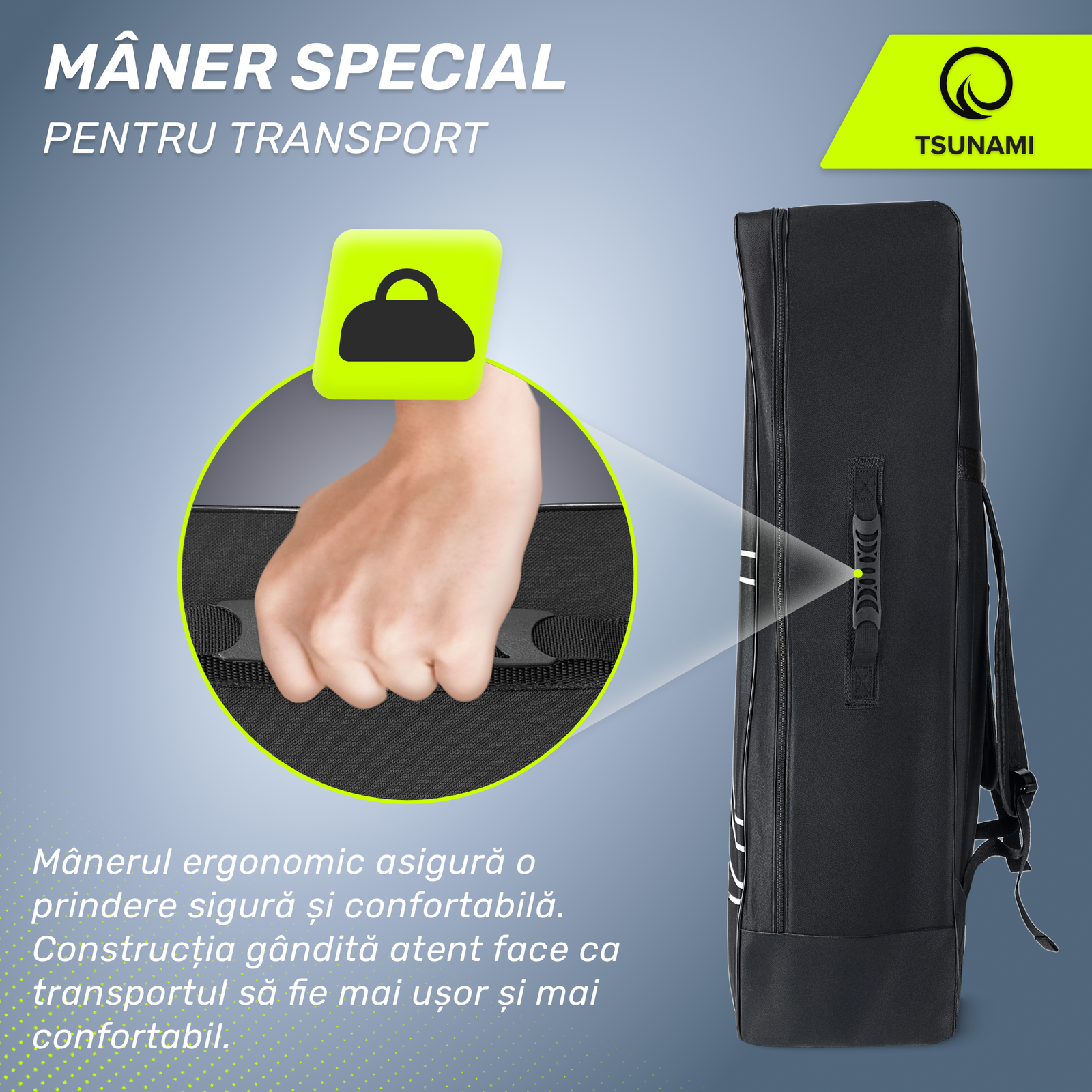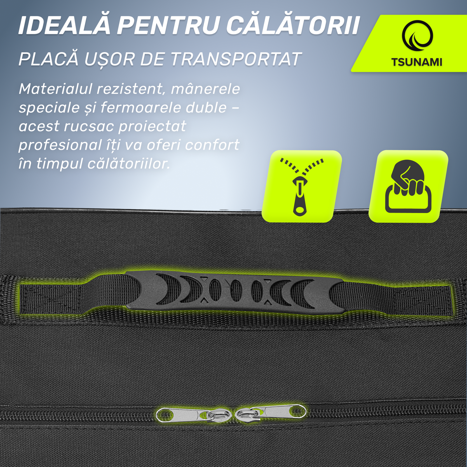 O placă SUP este o parte integrantă a aventurilor pe apă. Cu toate acestea, pentru a o transporta în siguranță și confortabil, aveți nevoie de un rucsac de încredere. Modelul TSUNAMI este o soluție extrem de încăpătoare, potrivită nu numai pentru transportul plăcii, ci și pentru alte accesorii, cum ar fi un cort sau echipamente suplimentare de camping. <Rucsacul TSUNAMI este funcționalitate și confort într-unul singur. Este o opțiune practică pentru entuziaștii în aer liber care au nevoie de o modalitate fiabilă de a-și transporta placa SUP.