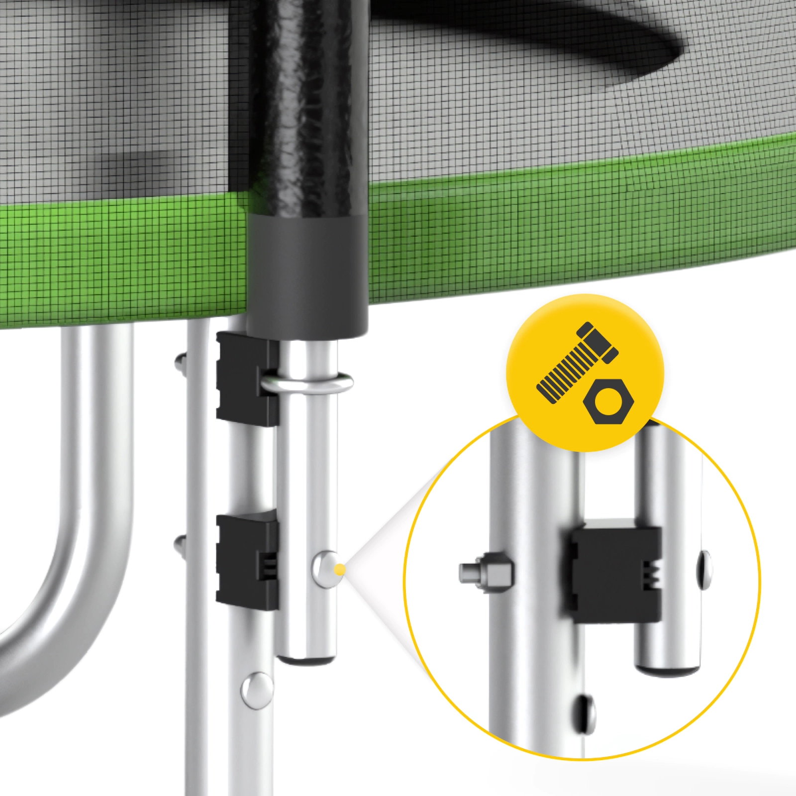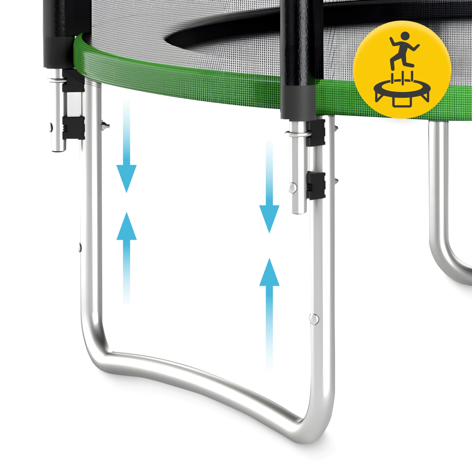 O rezistență sporită este asigurată de construcția din oțel galvanizat, ale cărei stâlpi sunt acoperiți cu spumă groasă, iar arcurile sunt galvanizate prin metoda in-out. Trambulina este stabilă și rezistentă la dezechilibru datorită picioarelor în formă de „U”, care asigură o distribuție uniformă a greutății.