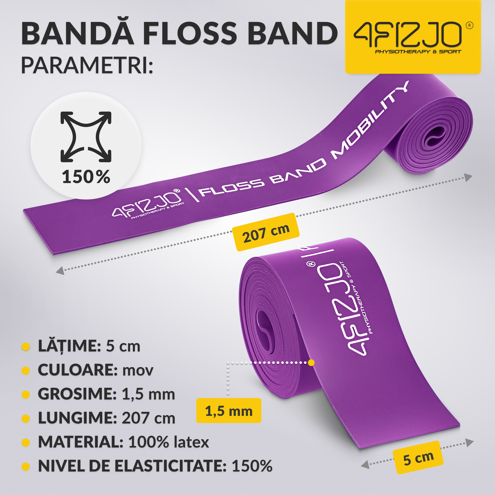 Alegerea dimensiunii potrivite a benzii de rezistență depinde de mărimea leziunii și de zona dureroasă. Cu cât este mai mică articulația sau grupul muscular, cu atât mai mică ar trebui să fie dimensiunea benzii. FLOSS BAND 4FIZJO cu o grosime de 1,5 mm este destinată articulației cotului, gleznei sau încheieturilor mâinilor. Benzile de terapie prin compresie asigură o aplicare sigură, oferind confort maxim în timpul exercițiilor.