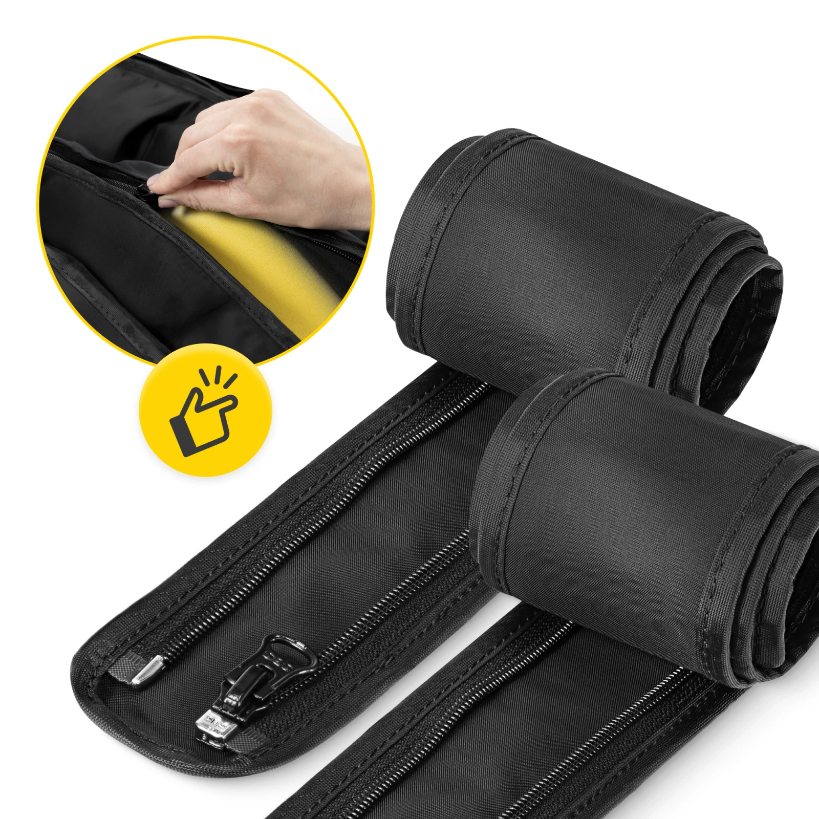 Dispun de două fermoare, care facilitează atașarea rapidă și ușoară.