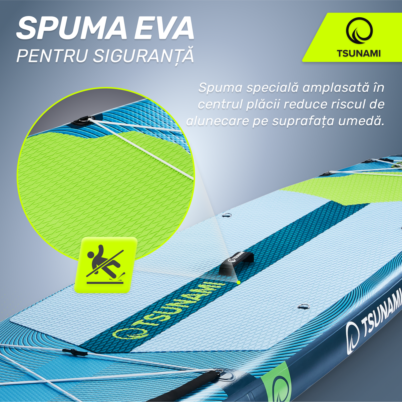 ▶️ Spumă EVA – în zona centrală a plăcii se află o spumă specială care reduce riscul de alunecare pe suprafața umedă.