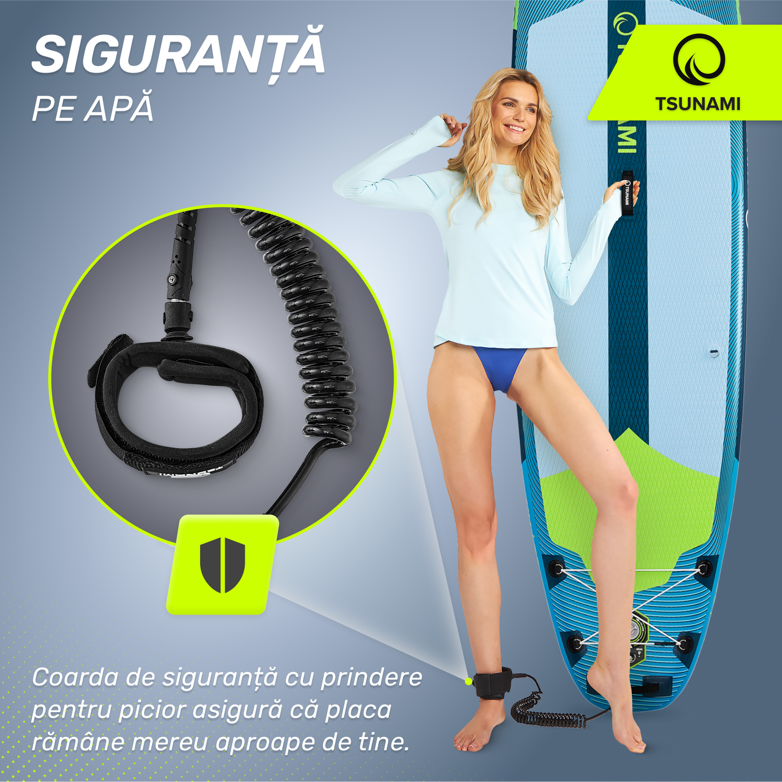 Și dacă totuși cazi? Nu-ți face griji! Placa nu va pluti departe, lăsându-te în mijlocul lacului sau al golfului. Coarda atașată de placă și de piciorul tău va menține echipamentul mereu la îndemână.