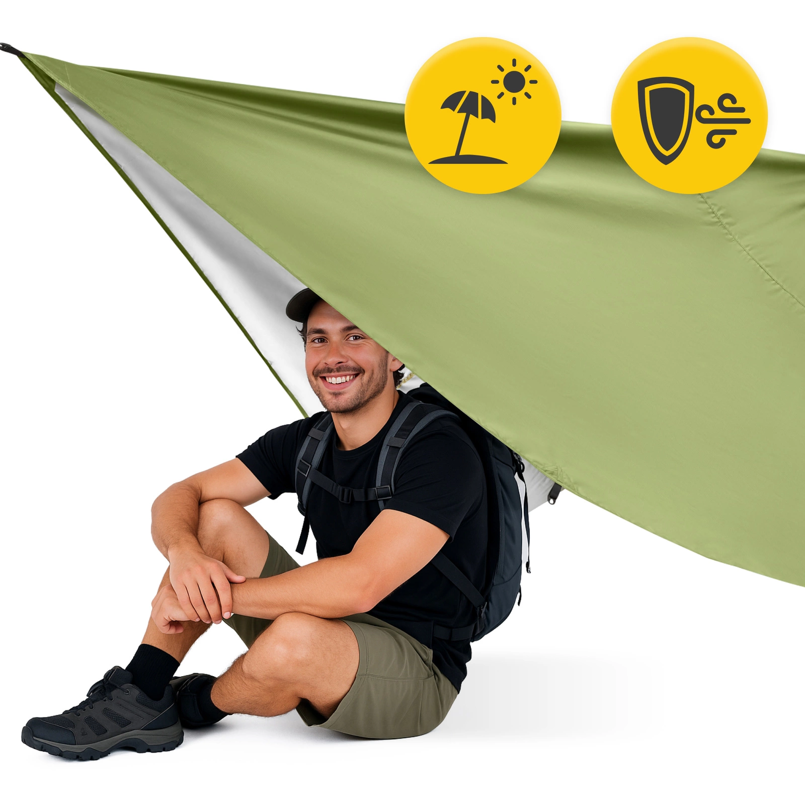 Prelata de camping MOUNTAIN GOAT este o alternativă ușoară și practică la cort, pe care o puteți împacheta ușor, transporta și monta rapid. Printre avantajele prelatei de camping MOUNTAIN GOAT se numără:
