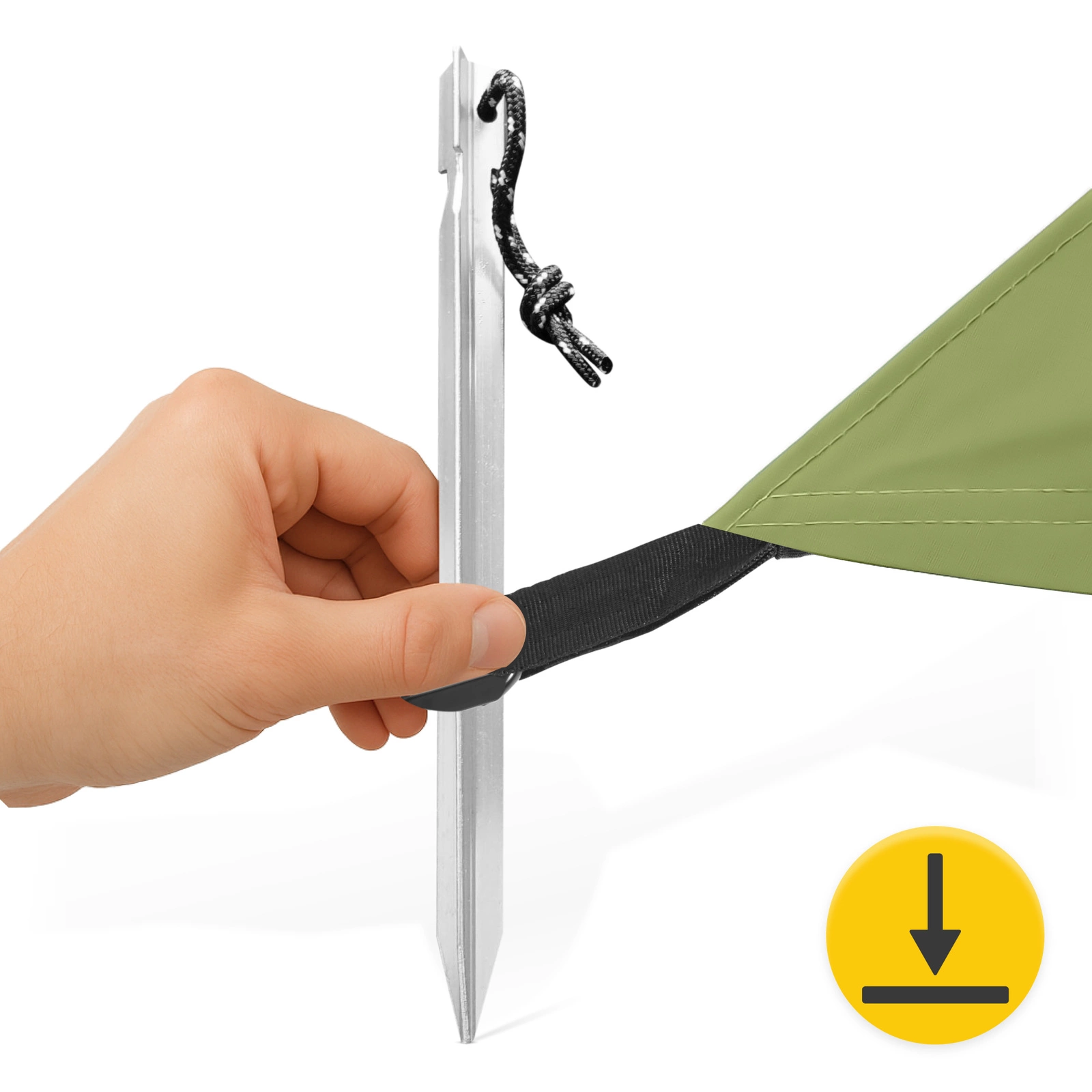 ▶️ Fixați prelata la sol cu cuie sau frânghii. Întindeți fiecare colț în mod egal.