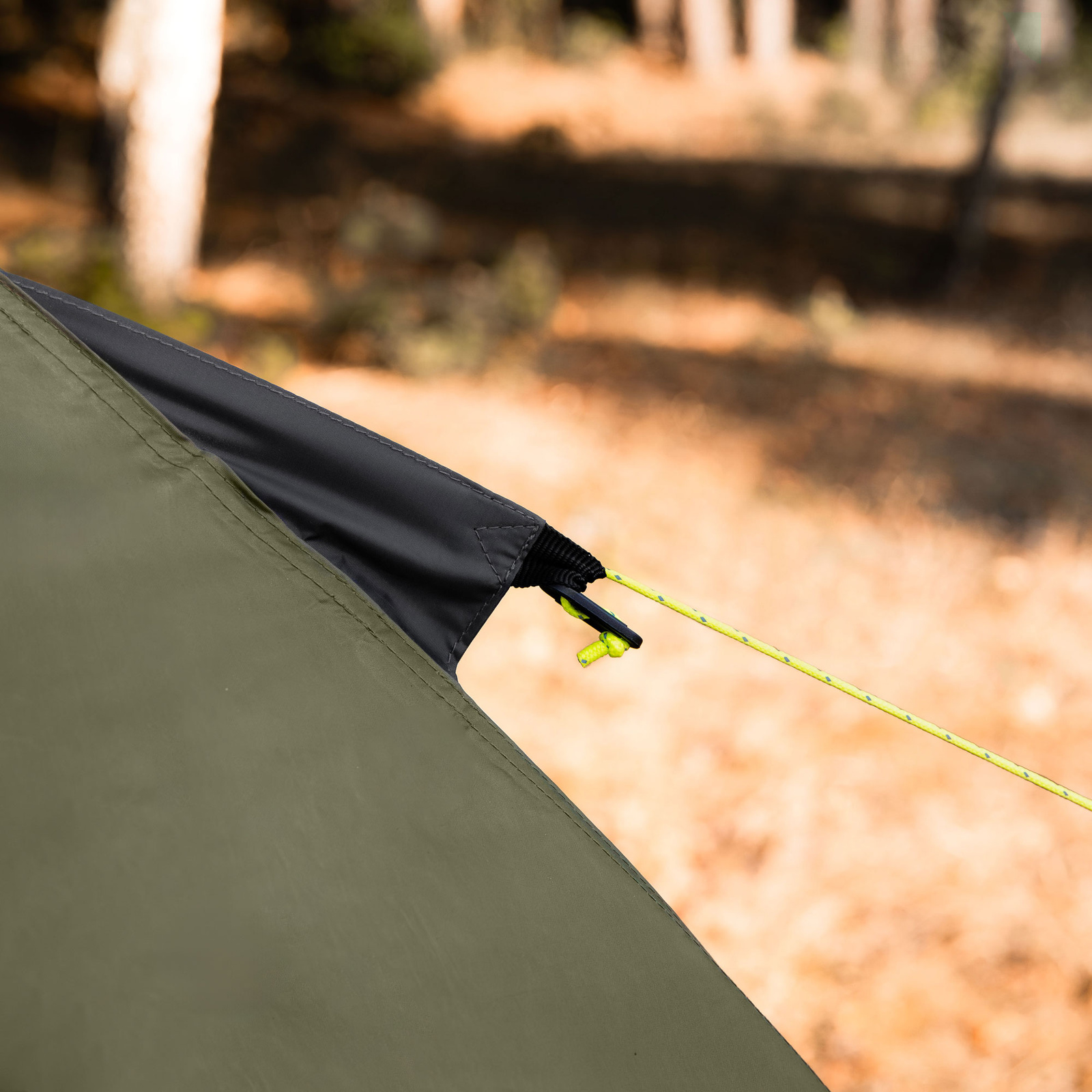 Nu trebuie să vă faceți griji cu privire la ploaie sau roua de dimineață. Musca cortului este fabricată din poliester impermeabil (4000 mm H₂O), iar podeaua este fabricată din polietilenă rezistentă la infiltrații (6000 mm H₂O). În plus, cusăturile au fost atent tapetate pentru a preveni scurgerile în zonele cele mai predispuse la umiditate.