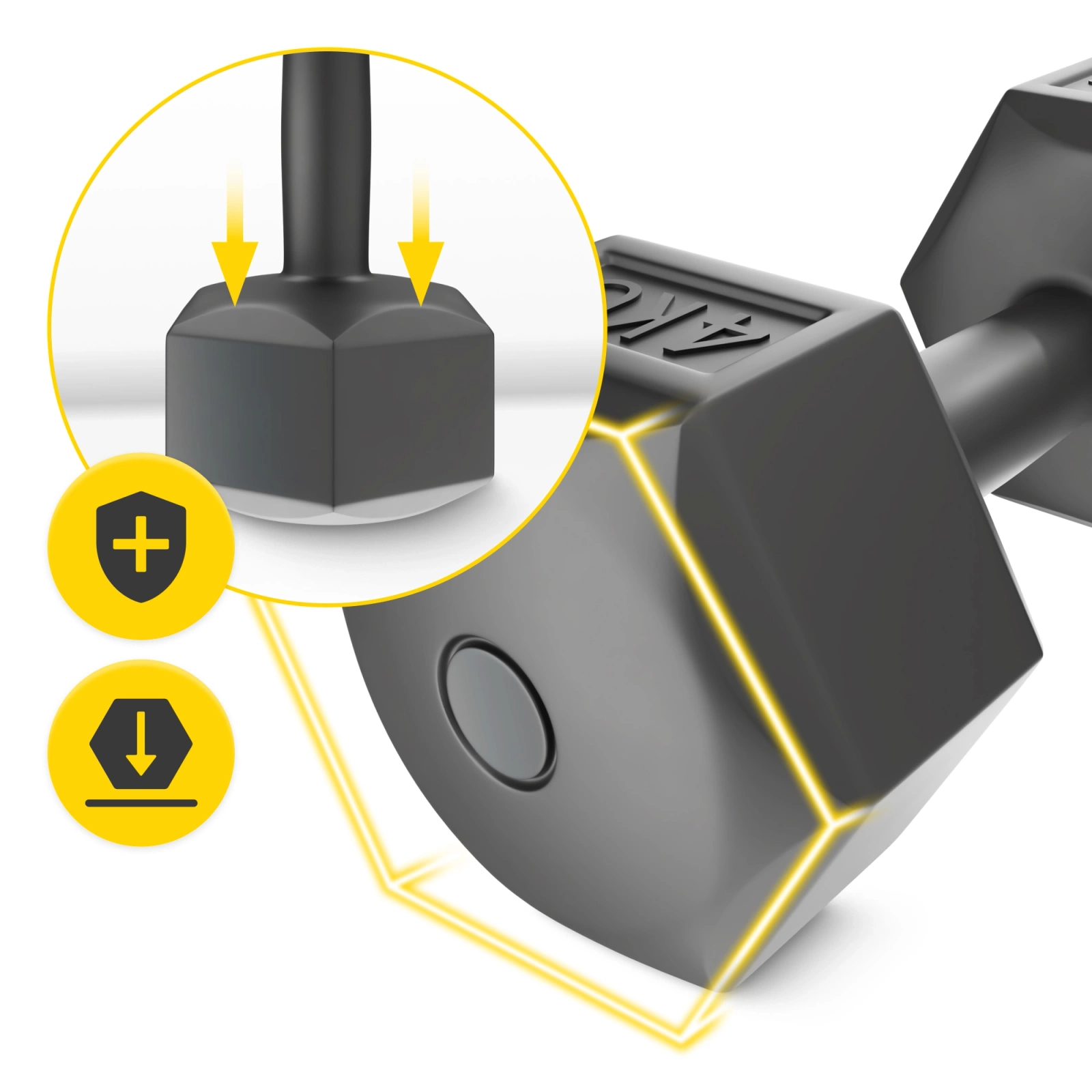 ▶️ Învelișul halterelor protejează podeaua de zgârieturi, iar forma hexagonală împiedică echipamentul să se rostogolească pe podea, ceea ce sporește siguranța în timpul antrenamentului.