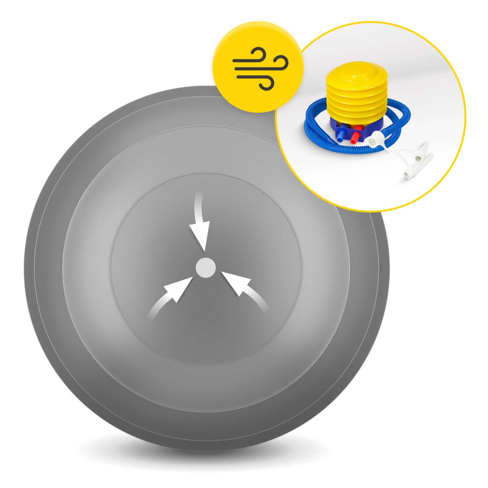 ▶️ Umflați mingea - dacă doriți să dezumflați mingea, pur și simplu faceți pârghie în sus și scoateți dopul alb. Vă puteți ajuta așezându-vă pe minge.