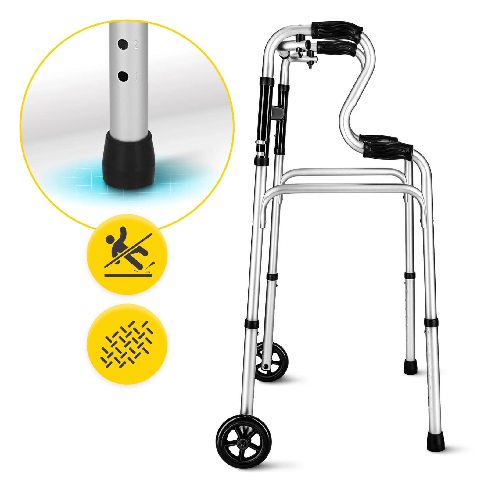 Acest balcon modern combină două funcții într-un singur dispozitiv – utilizatorul poate comuta cu ușurință între modul fix și modul de mers, adaptând echipamentul la capacitățile și nevoile sale de reabilitare. Partea din față este echipată cu roți cu diametrul de 5” (12 cm), care facilitează deplasarea, iar partea din spate este prevăzută cu capace din cauciuc pentru aderență și control maxim pe suprafețe netede.