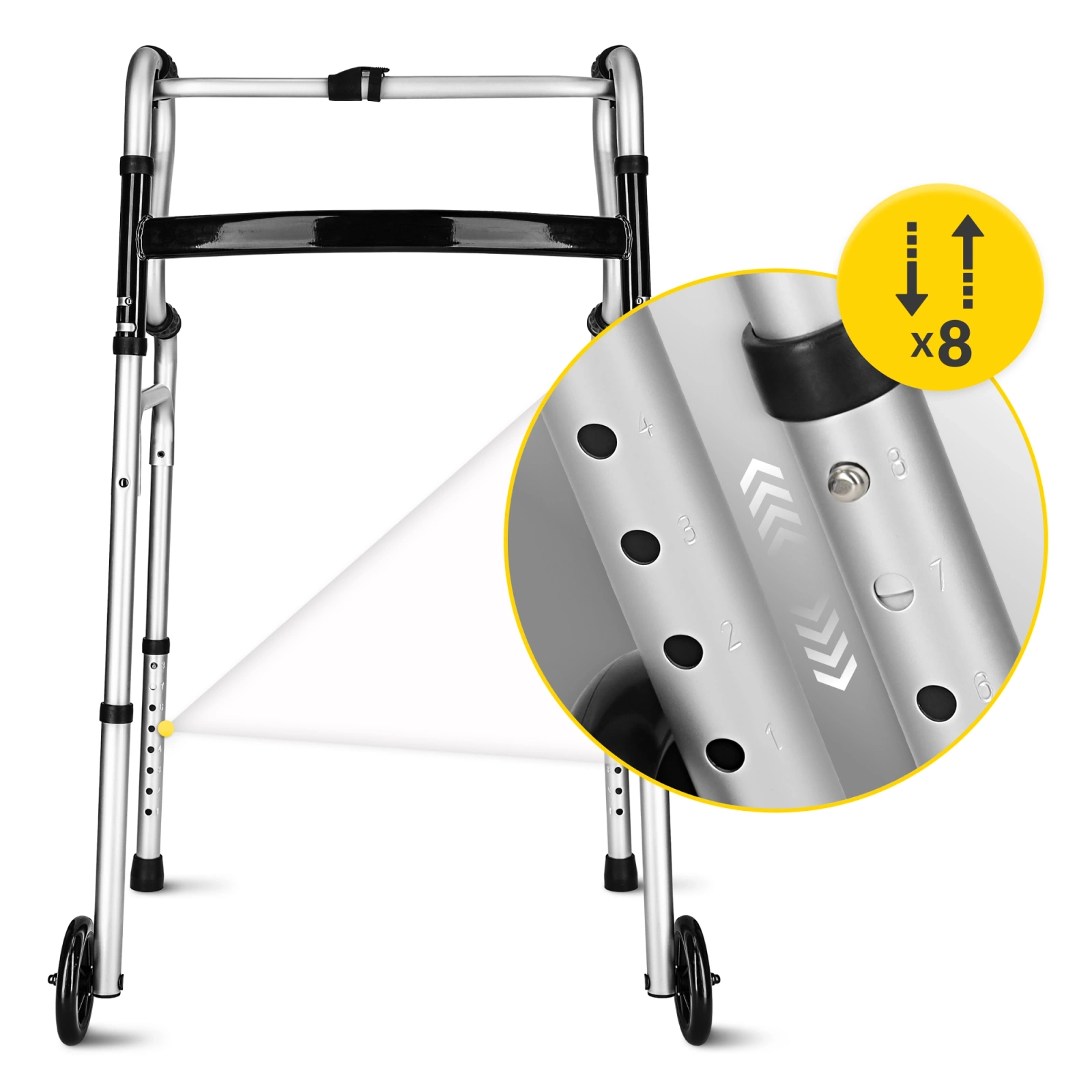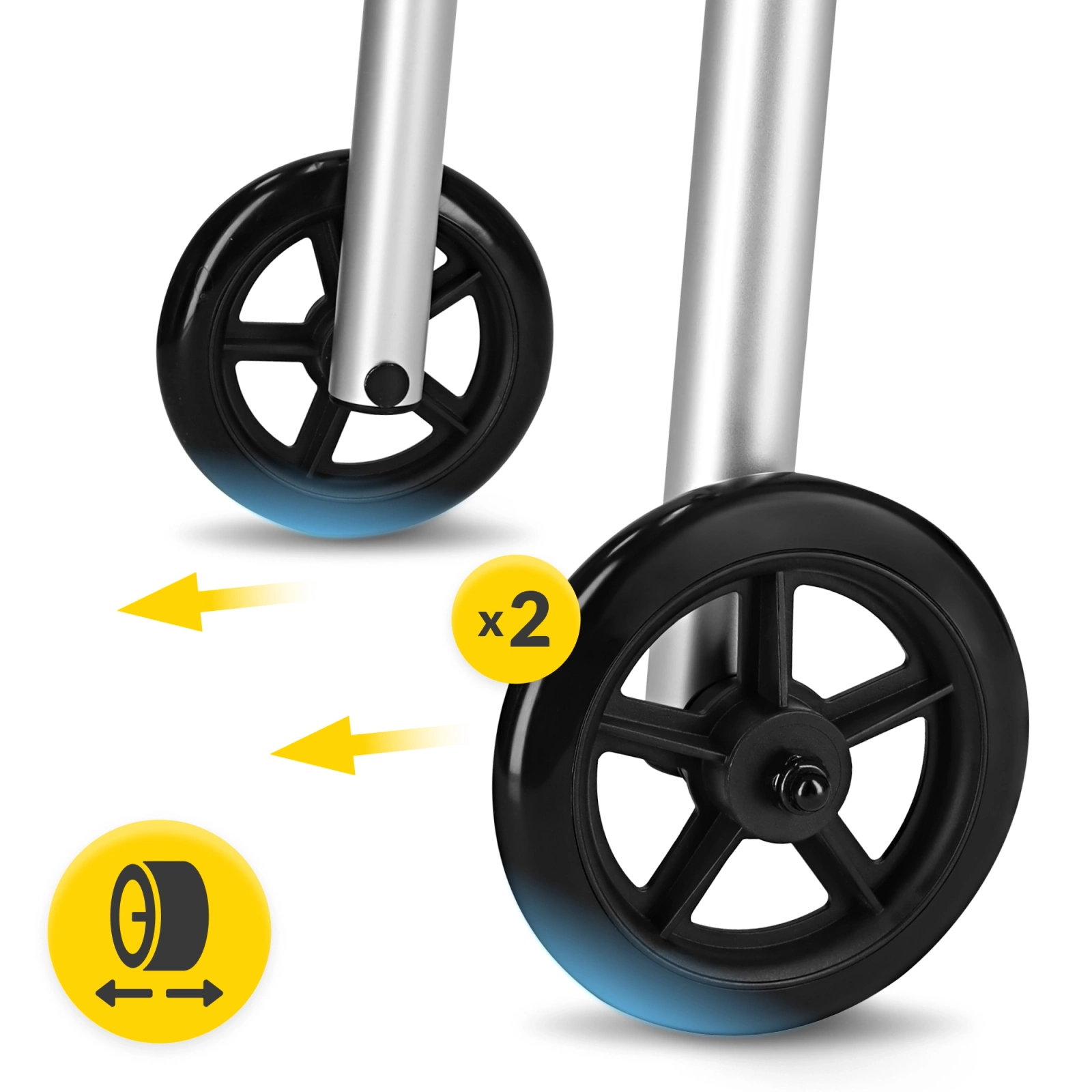 Roțile încorporate cu diametrul de 5” (12 cm) facilitează deplasarea dispozitivului înainte – deosebit de utile pe distanțe lungi sau pe suprafețe dure.