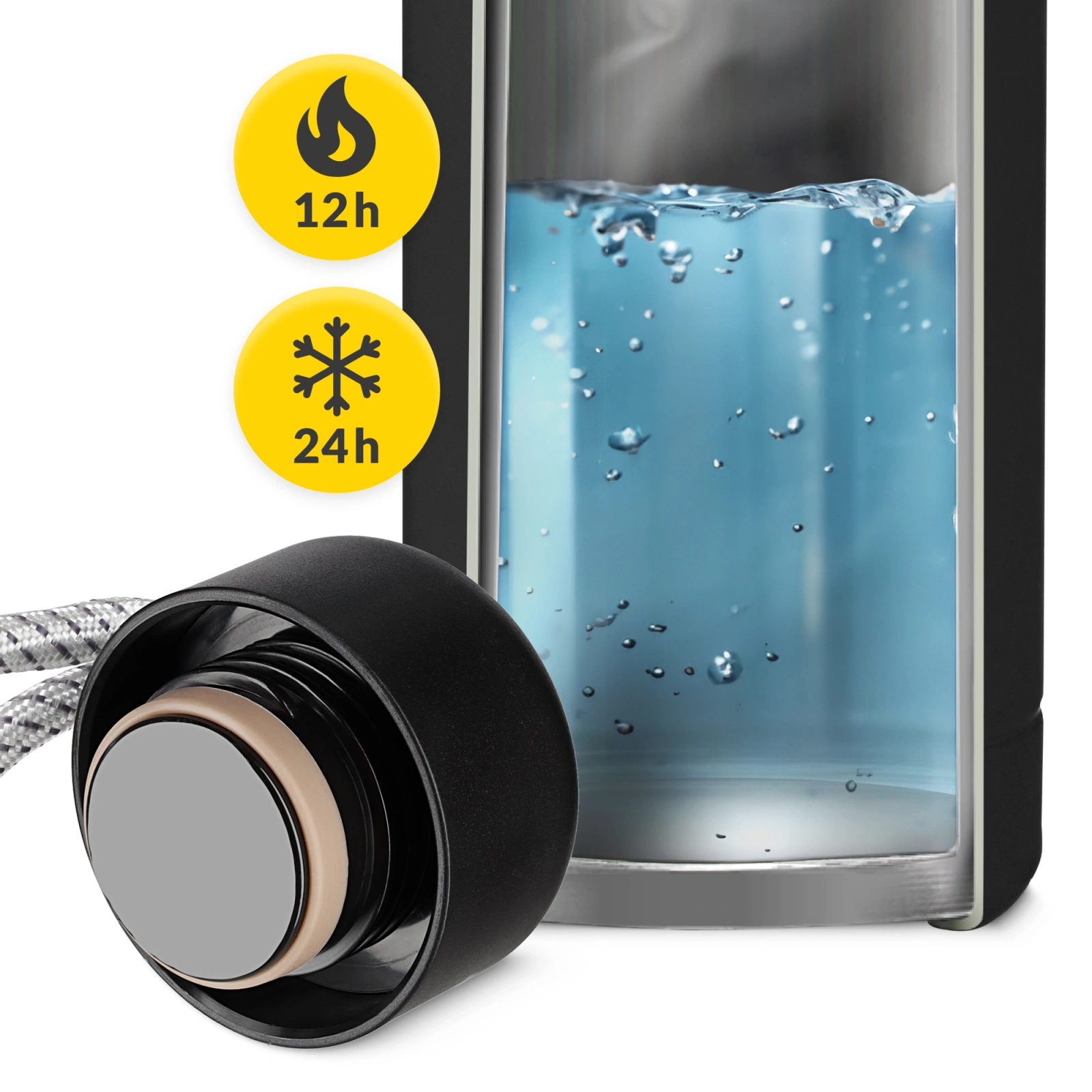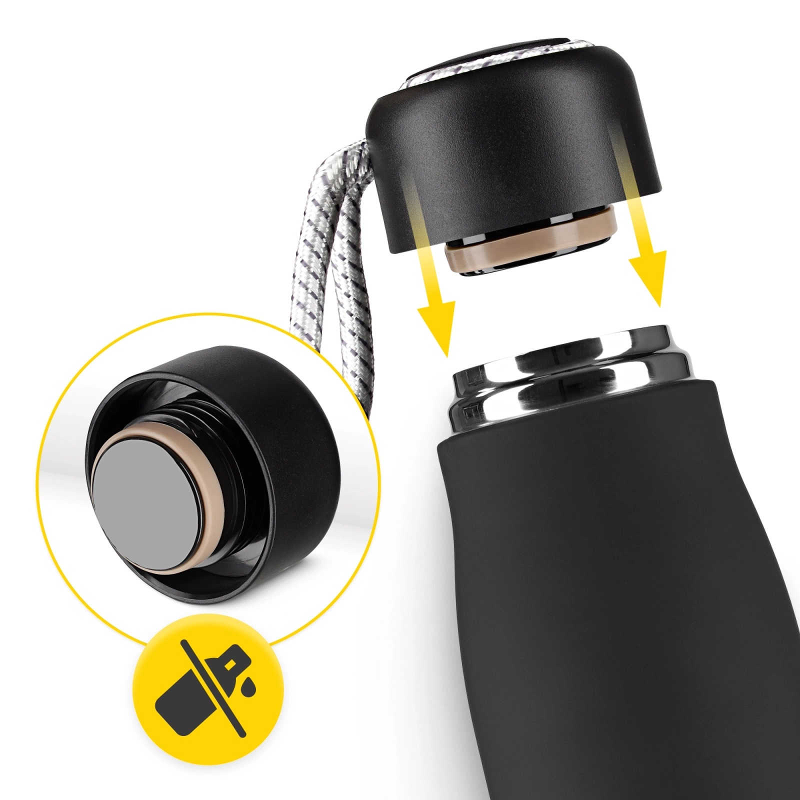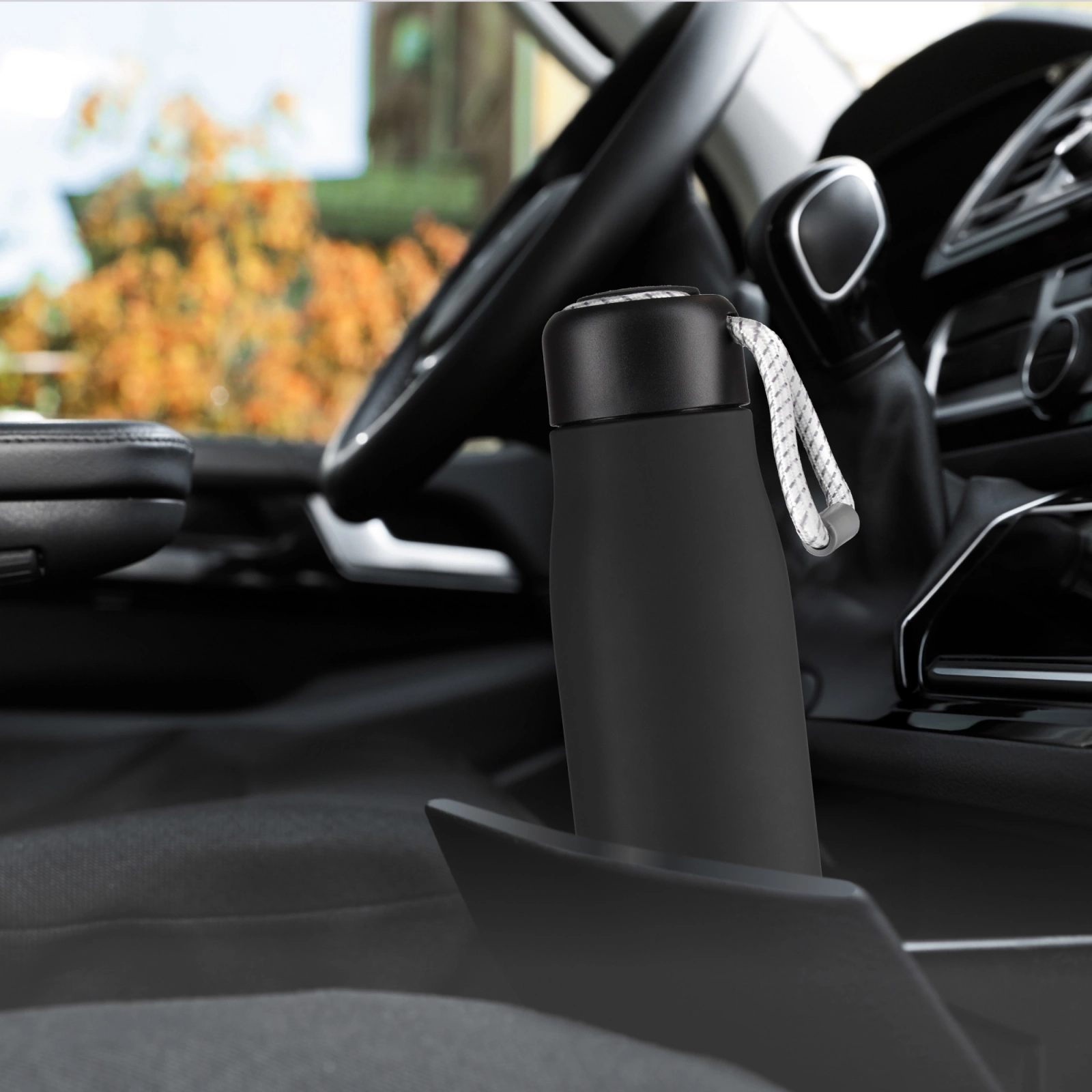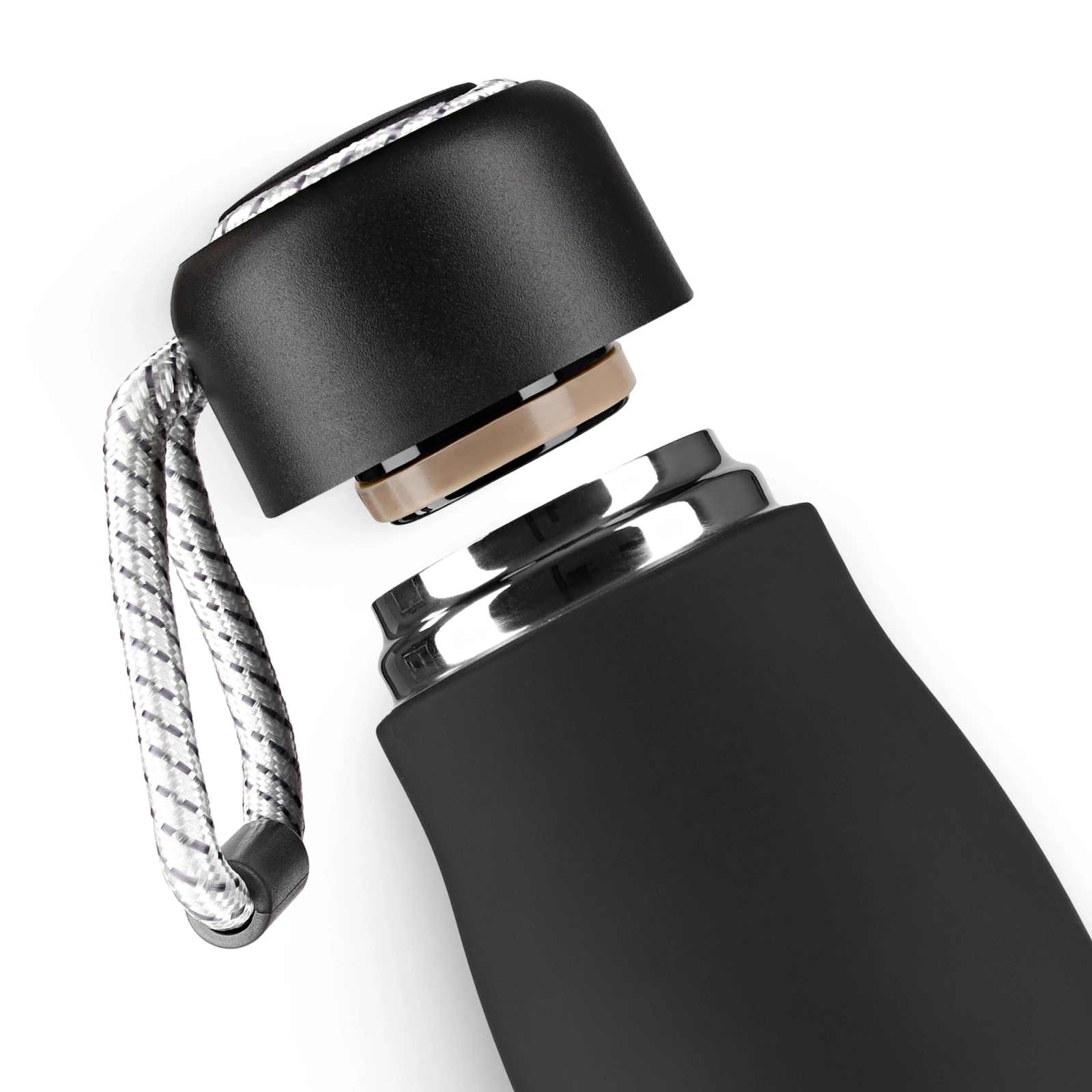 Datorită designului minimalist și dimensiunilor compacte, sticla încape într-o geantă de sport, rucsac sau chiar într-o geantă de mână mai mare. Învelișul exterior antiderapant asigură o prindere sigură, iar cordonul rezistent facilitează transportul și atașarea la rucsac. Luați-o la birou, la antrenament, într-o excursie la munte sau pur și simplu folosiți-o în fiecare zi.