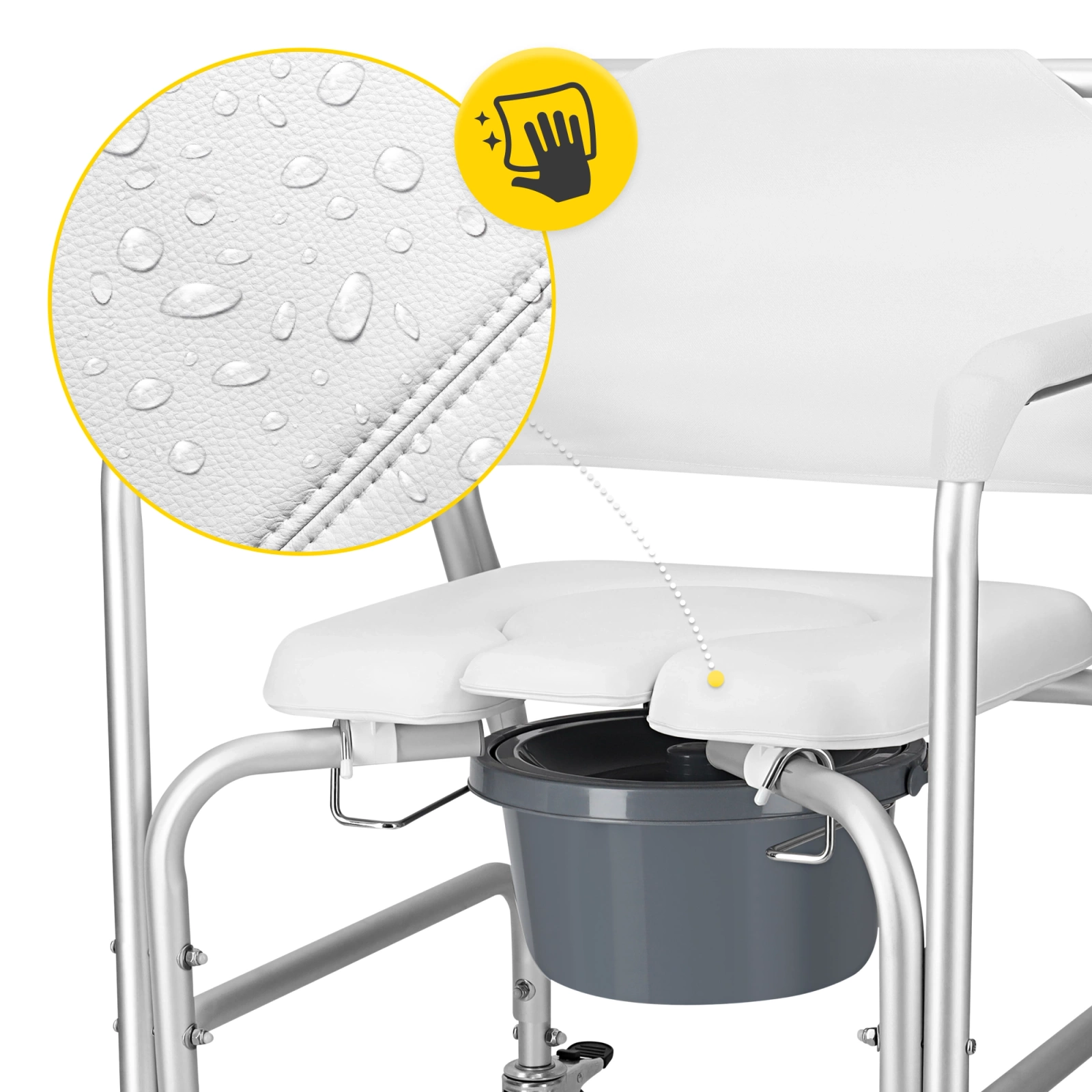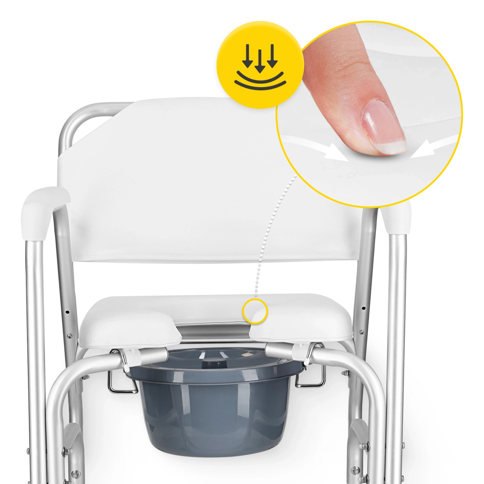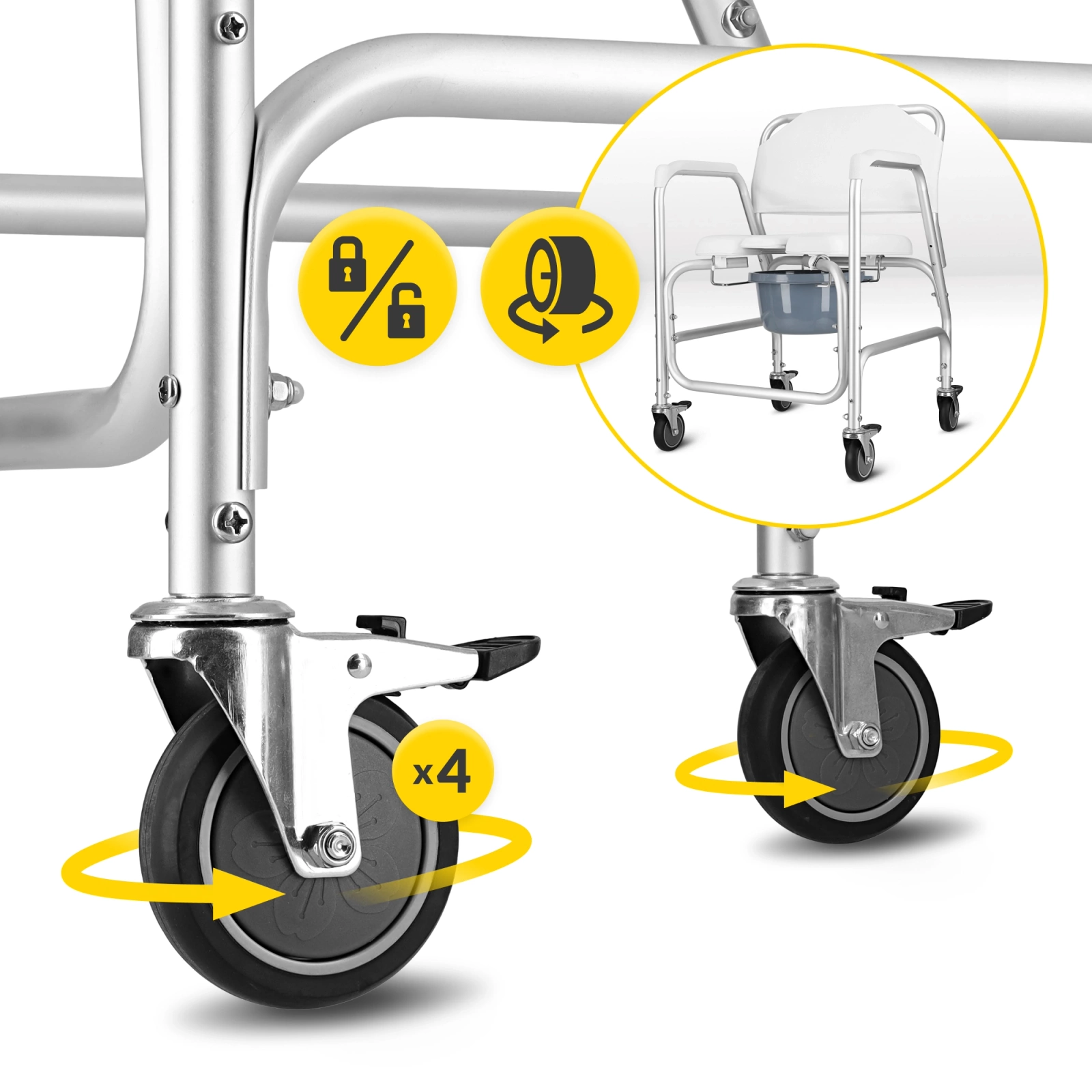 ✔️ Caracteristici principale: recipient sanitar detașabil cu capac, cotiere pentru a vă ridica mai ușor, roți cu frâne de blocare, spătar și scaun confortabile, scaun ușor de curățat