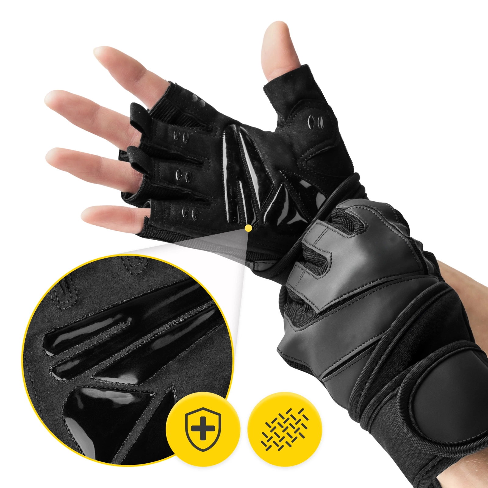 Interiorul mănușilor noastre de antrenament PRO este acoperit cu protuberanțe din cauciuc întărit antiderapant care întăresc eficient prinderea și împiedică alunecarea greutăților. Acestea sunt elementele care vor face antrenamentele dvs. extrem de confortabile.
