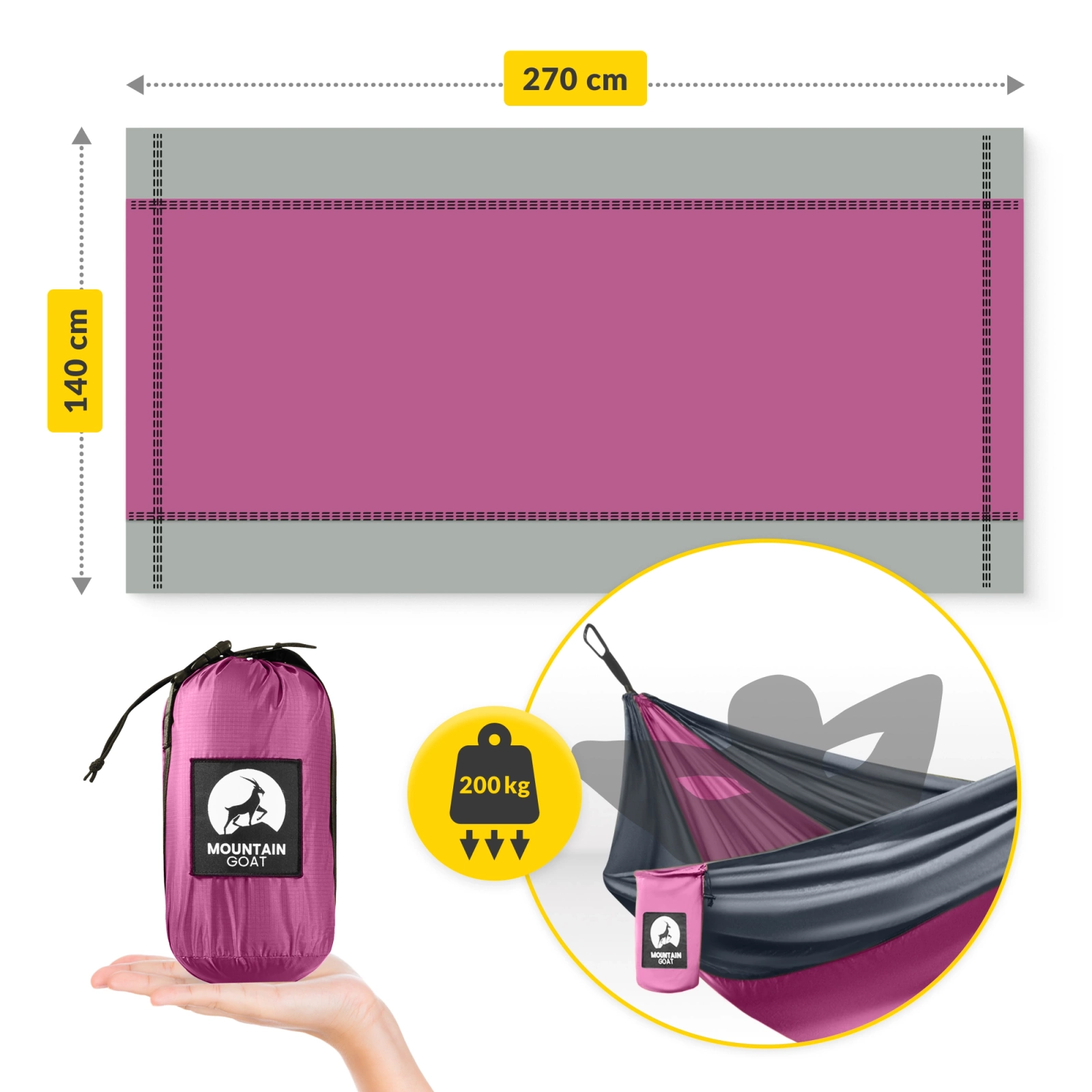 Un alt avantaj al hamacului nostru de camping este folosirea materialelor de cea mai bună calitate. Pentru producția hamacului MOUNTAIN GOAT s-a utilizat nylon de parașută 210T, respirabil și plăcut la atingere, durabil și rezistent la umiditate. Astfel, hamacul va fi un ajutor de încredere în sălbăticie pentru drumeți, vânători sau fotografi.