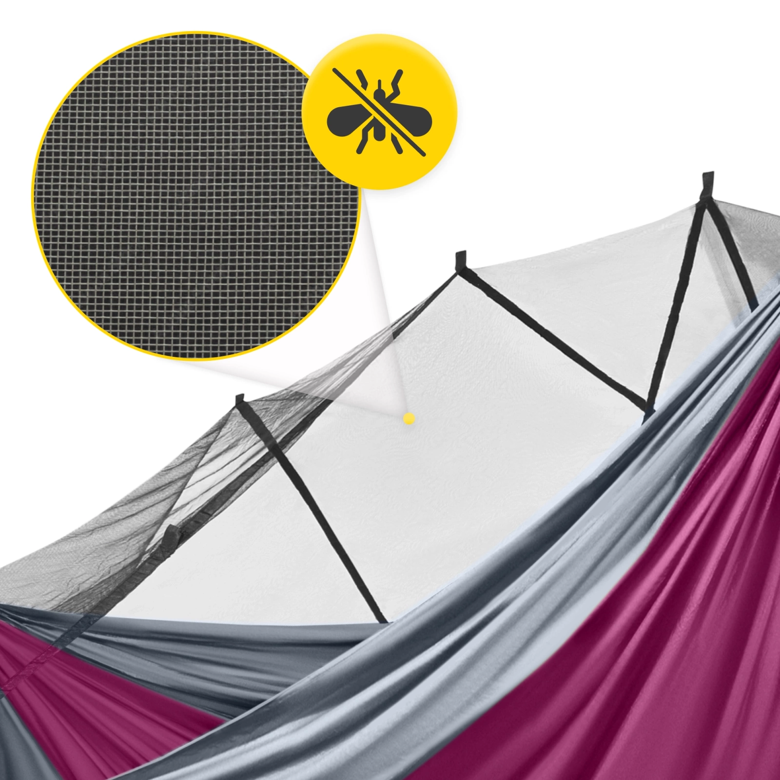 Plasa de țânțari este realizată dintr-o plasă fină, care permite circulația aerului, oferind totodată o barieră solidă împotriva insectelor, și este montată permanent pe hamac.