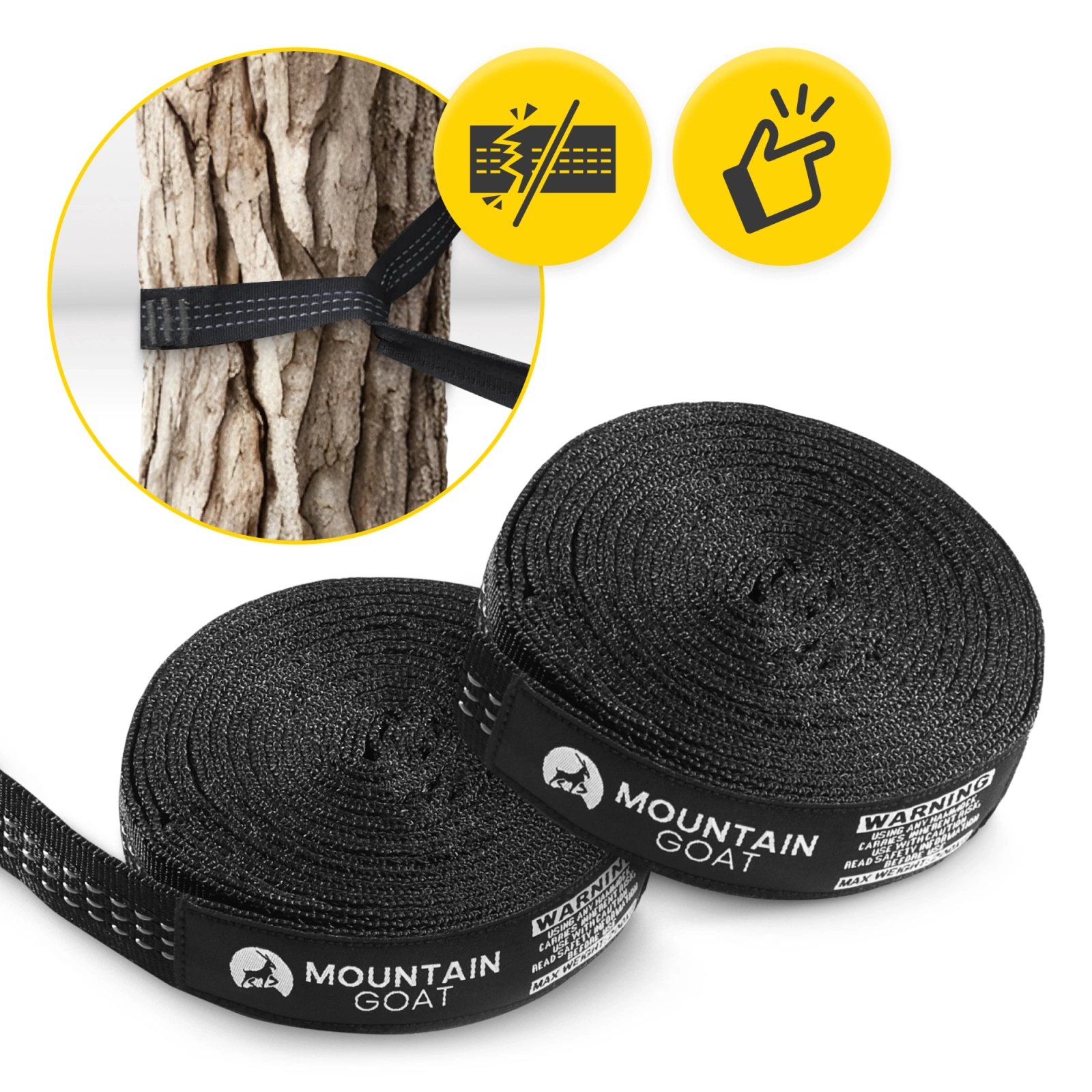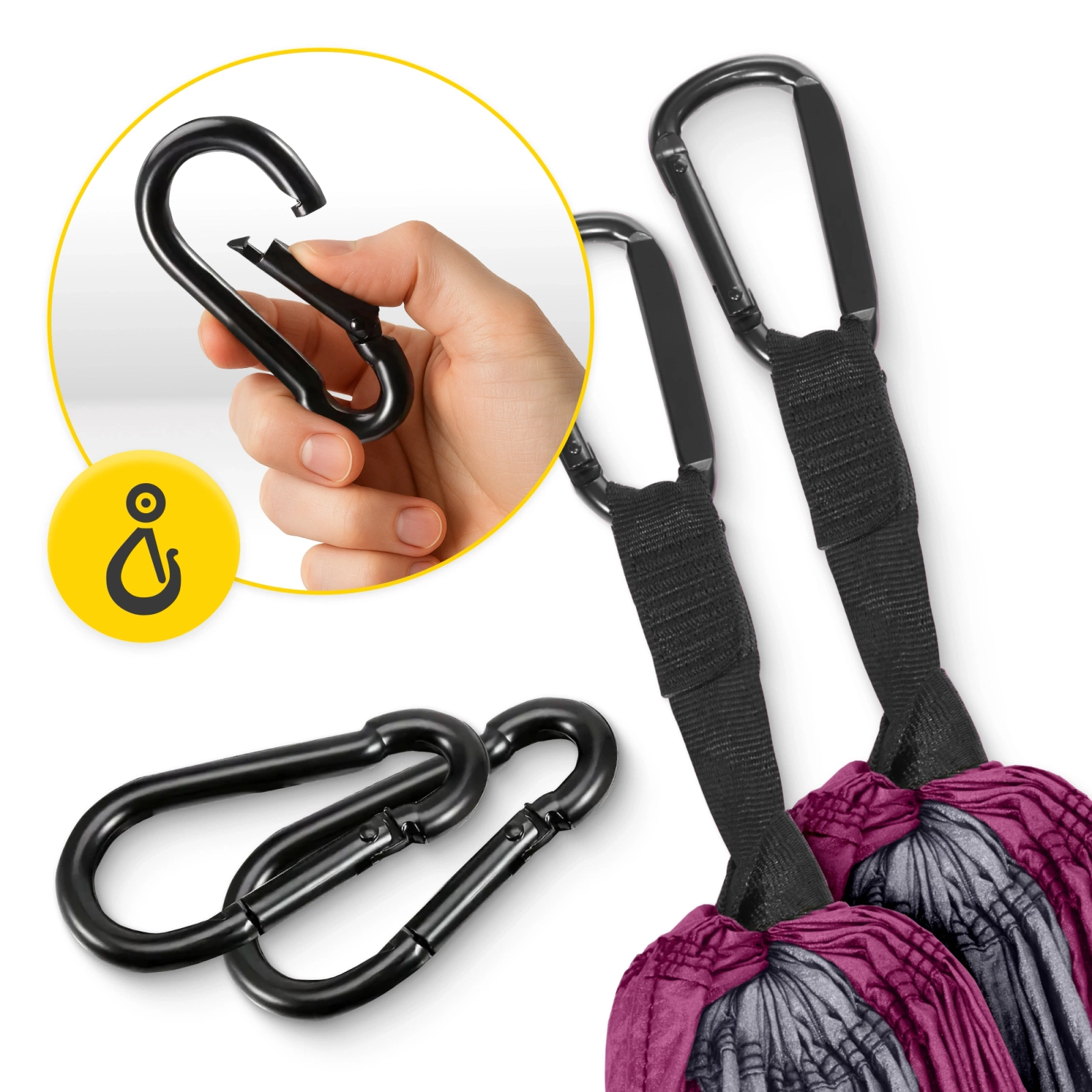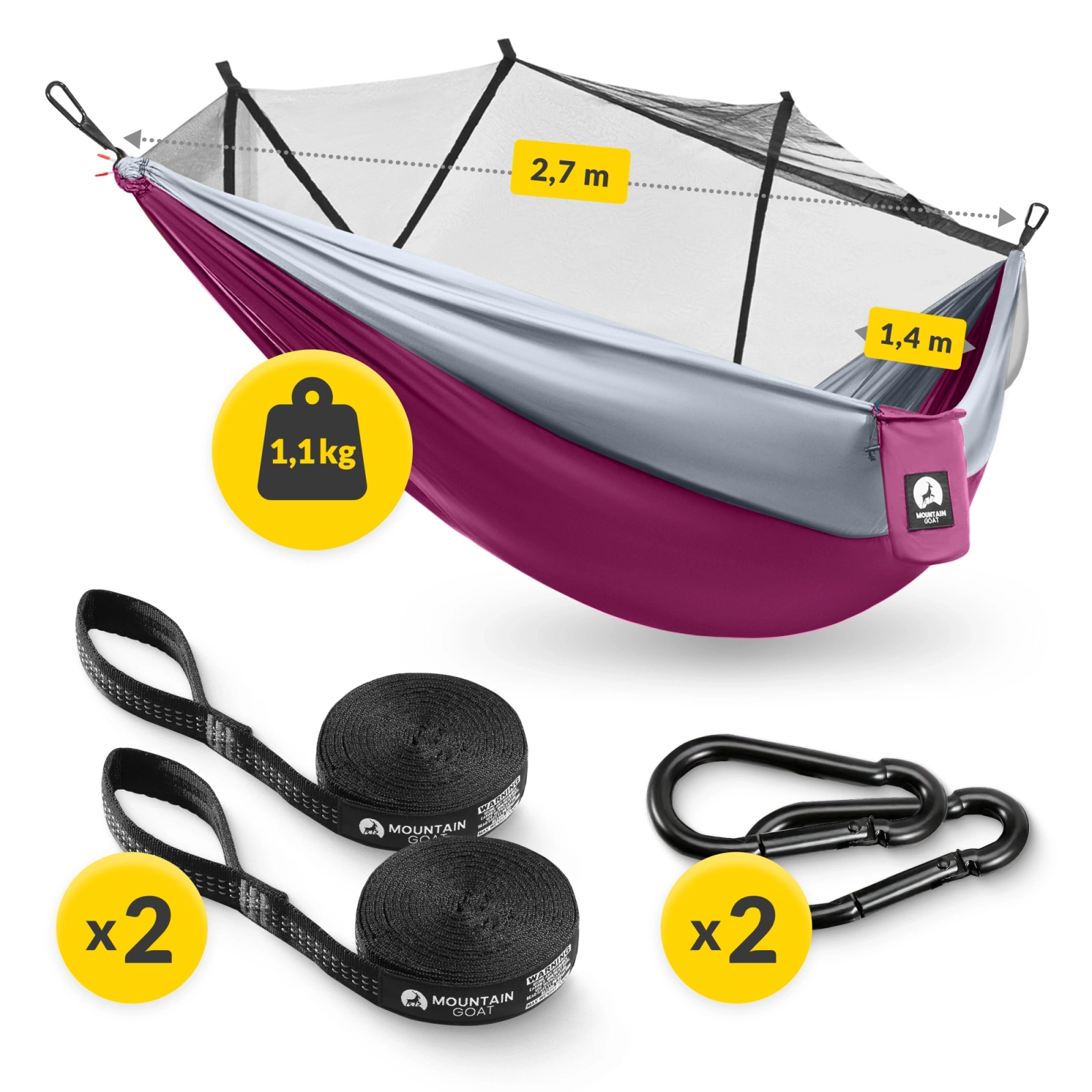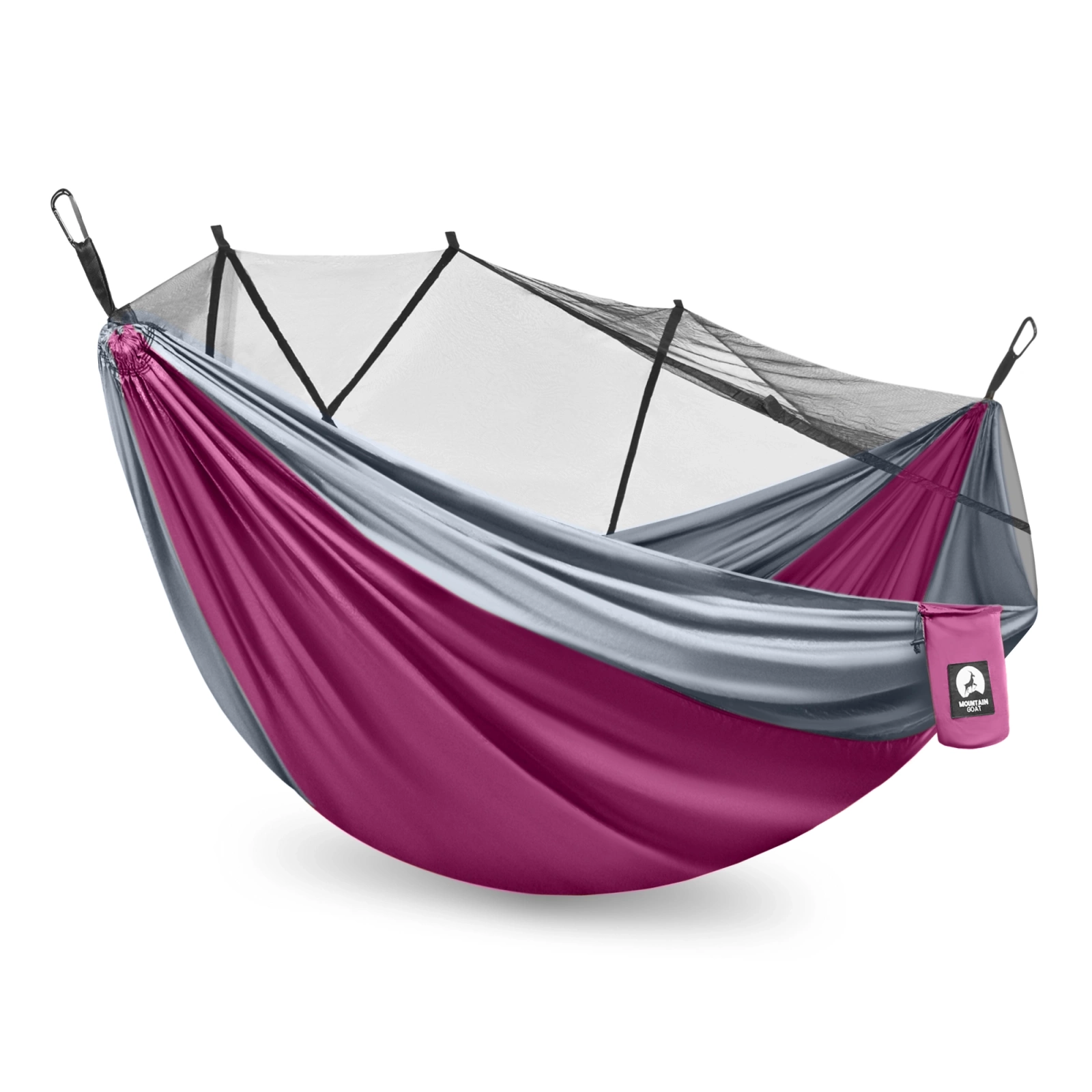 Alegând hamacul de camping pentru o persoană cu plasă de țânțari MOUNTAIN GOAT, primești benzi și carabiniere, care permit agățarea rapidă și ușoară a hamacului oriunde.