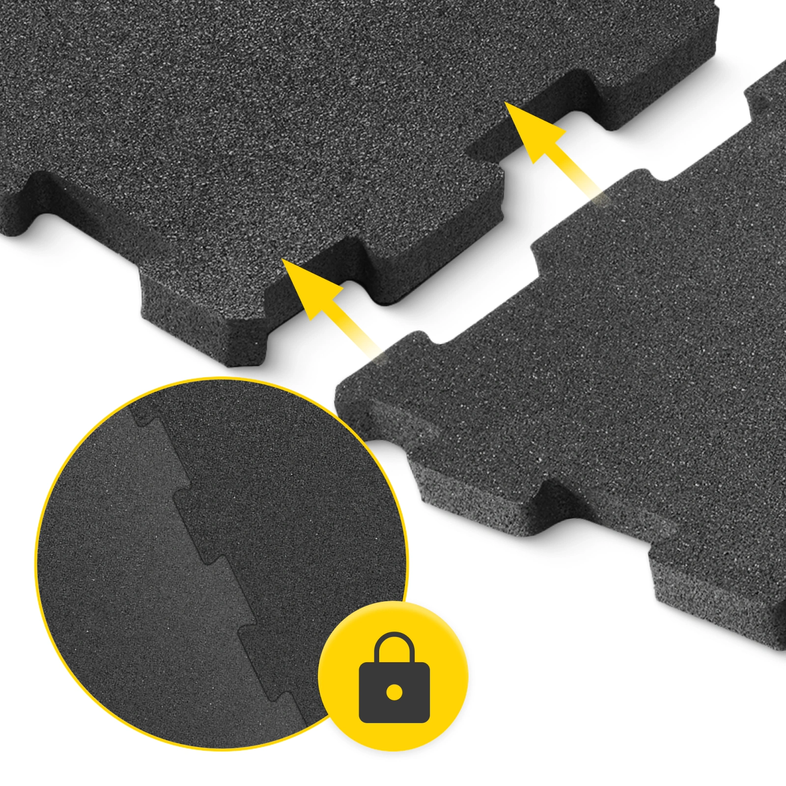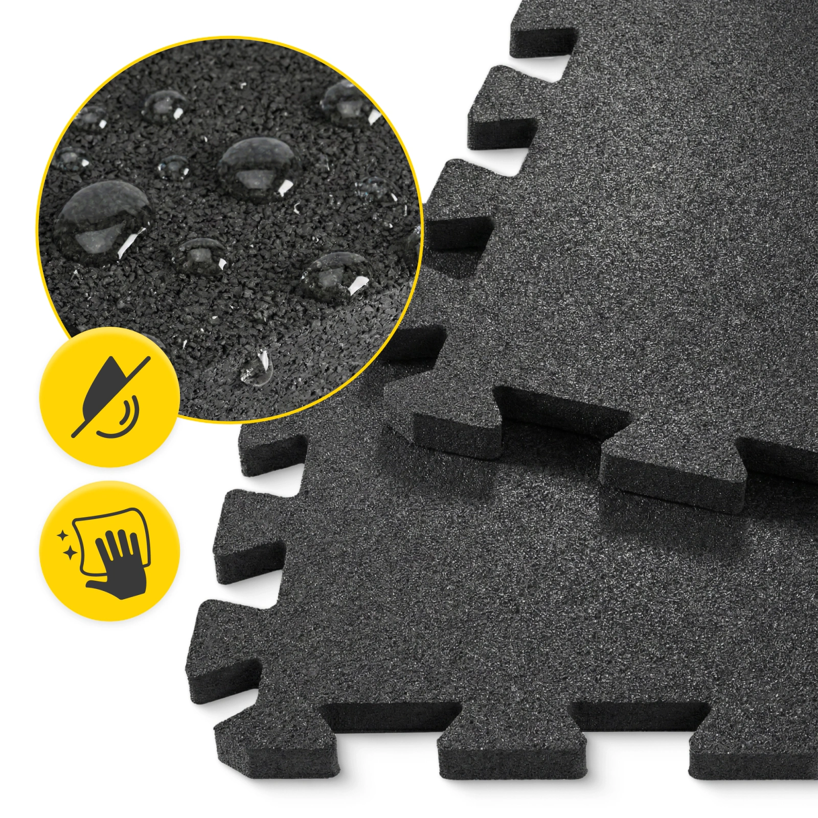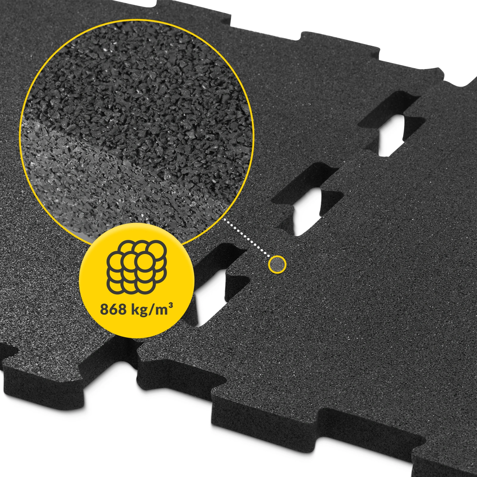 Setul nostru de puzzle-uri din cauciuc pentru sală este realizat din material durabil și rezistent. Salteaua, după asamblare, nu doar că suportă sarcini mari, dar absoarbe eficient șocurile și reduce zgomotul (de exemplu cel cauzat de căderea barei sau a ganterelor). În plus, materialul setului are o structură densă și este ușor poros, ceea ce ajută la prevenirea deteriorării pardoselii.