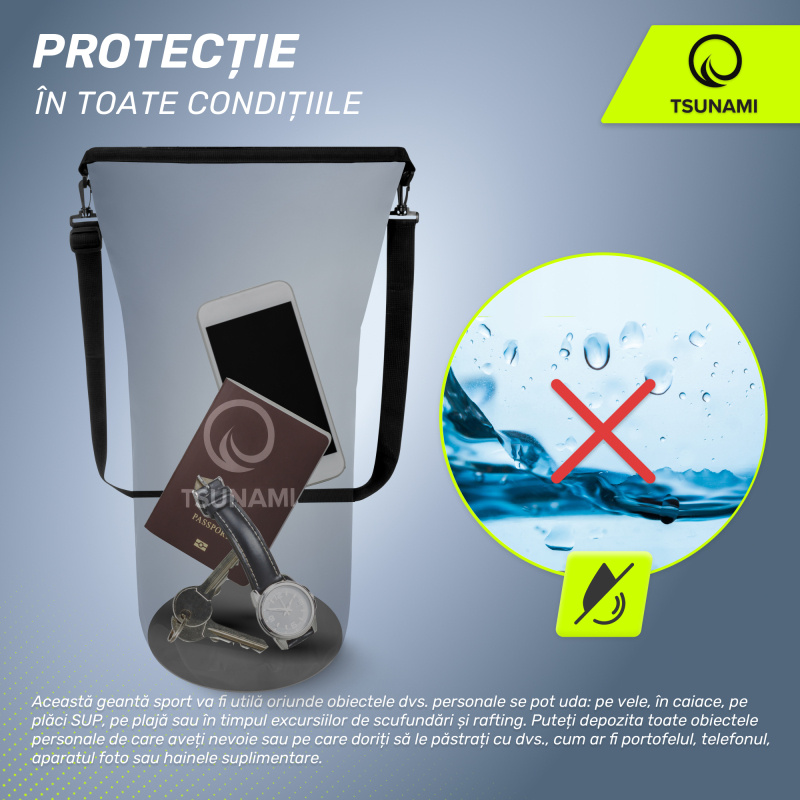 Vâslește într-un caiac, navighează cu barca sau placa SUP, participă la rafting sau la ieșiri cu vele fără să-ți faci griji pentru udarea telefonului, documentelor sau hainelor. Cu sacul sportiv impermeabil TSUNAMI, valurile și ploaia, chiar și cea torențială, nu vor mai reprezenta o problemă! Nu vei mai avea parte de surprize neplăcute cauzate de udarea accidentală a lucrurilor tale în timpul vacanțelor.