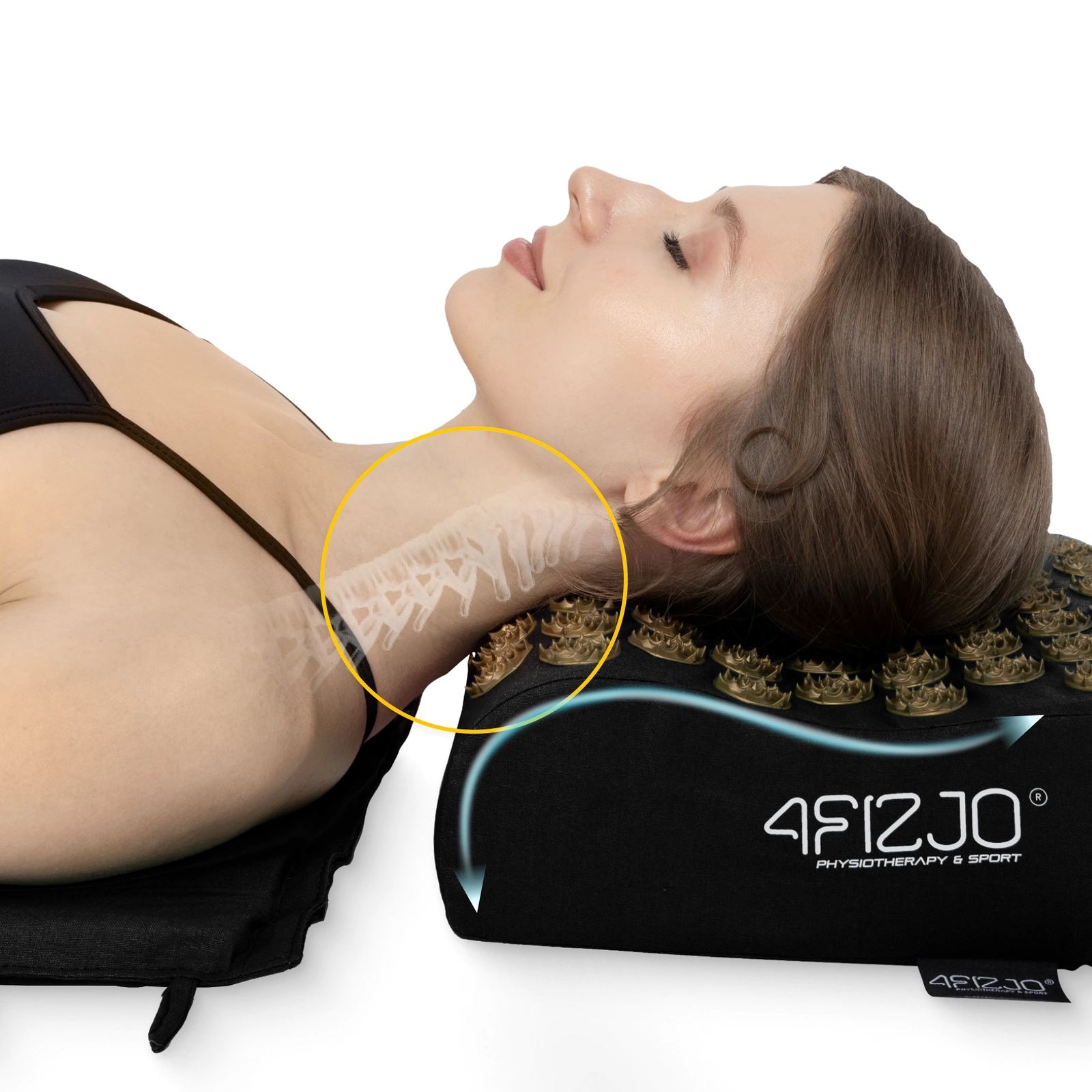 ▶️ Spatele capului în sus, permițând stimularea parților laterale ale craniului - ajutând la reducerea senzațiilor de tensiune și greutate în umeri