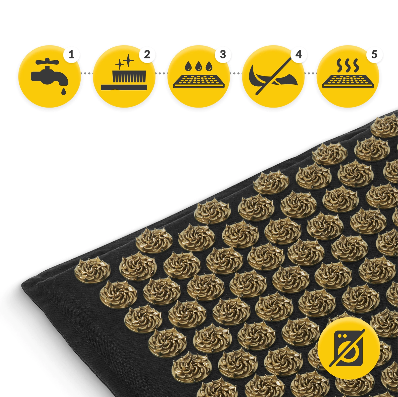 Spală covorul de presopunctură ECO 4FIZJO cu pernă și vârfuri de mână cu apă călduță cu săpun. Pentru a scăpa de praful din spațiile dintre vârfuri, folosește o perie moale. La final, clătește bine capacul. În niciun caz nu freca și nu stoarce materialul. Usucă-l numai pe plat. Nu uita! Covorașul de acupresură nu poate fi spălat în mașina de spălat și nici uscat în uscător. Depozitează-l în învelișul rulat cu vârfurile în interior.