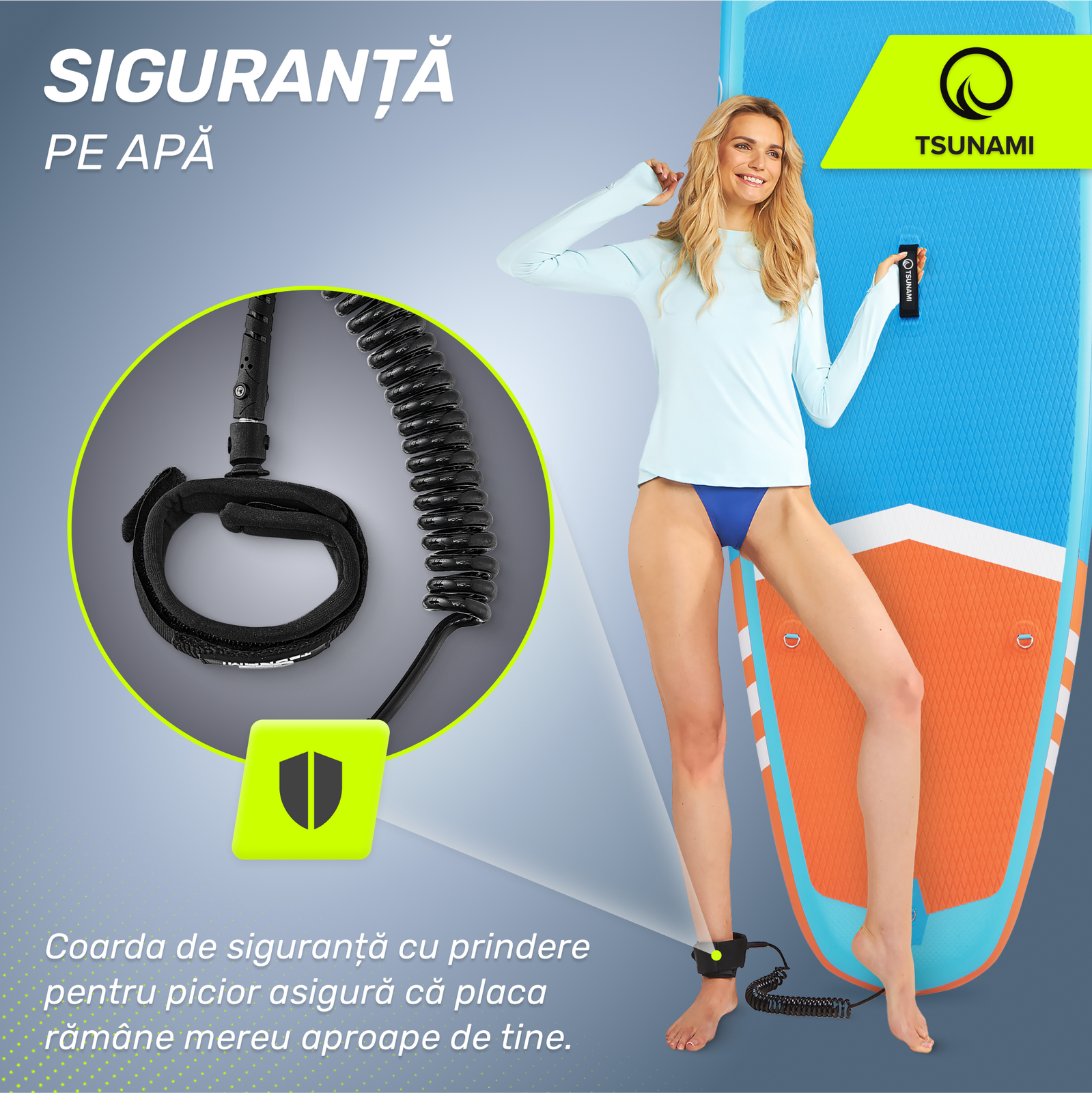 Pe apă, la fel ca în cazul altor sporturi, cel mai important lucru este siguranța. Noi ne-am ocupat de siguranța ta, echipând placa cu elemente contrastante care asigură o vizibilitate mai bună chiar și de la distanțe mai mari. Raportul potrivit între lungimea și lățimea plăcii oferă o stabilitate sporită și reduce riscul de a cădea în apă. Iar dacă totuși se întâmplă să cazi, nu-ți face griji – placa nu va pluti departe, lăsându-te în mijlocul lacului sau al golfului. Coarda atașată de placă și de piciorul tău va face ca echipamentul să fie mereu la îndemână.