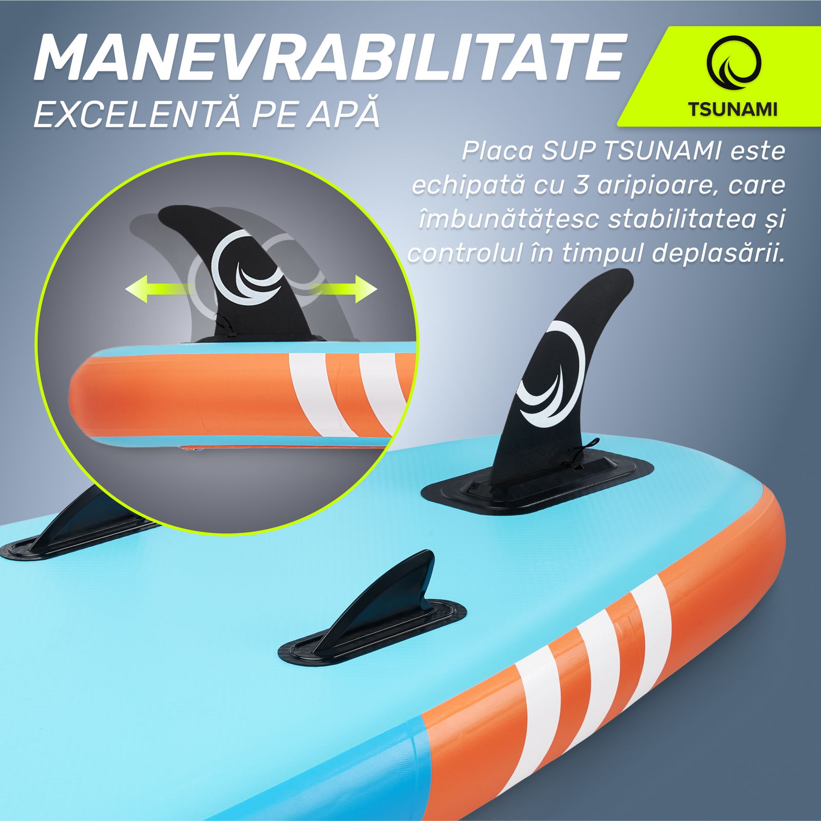 La confortul și siguranța navigării pe placa SUP contribuie în mod semnificativ și maniabilitatea acesteia. Aici nu există loc pentru compromisuri! De aceea, placa SUP TSUNAMI a fost echipată cu nu mai puțin de 3 stabilizatoare, care facilitează manevrarea plăcii. În plus, pagaia profilată inclusă în set a fost proiectată astfel încât să prindă mai multă apă, ceea ce garantează un vâslit mai eficient și un control și mai ușor al plăcii.