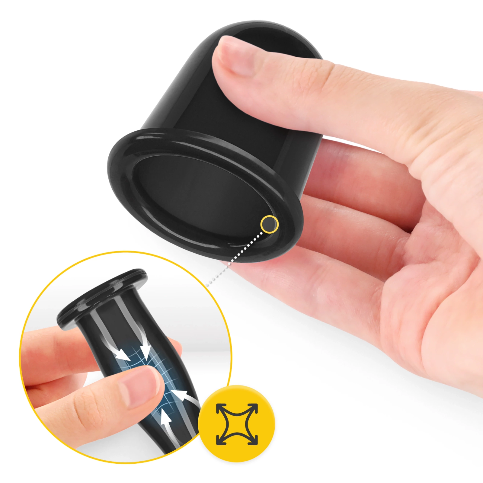 Acțiunea bulelor chinezești din silicon 4FIZJO este de a crea un vid care aspiră pielea și țesutul subcutanat în interiorul bulei. Vidul astfel creat ajută la stimularea circulației sângelui și stimulează sistemul imunitar să producă anticorpi. În plus, țesuturile sunt mai bine hrănite și oxigenate, ceea ce accelerează procesele regenerative. Pentru a efectua un masaj chinezesc cu bule: