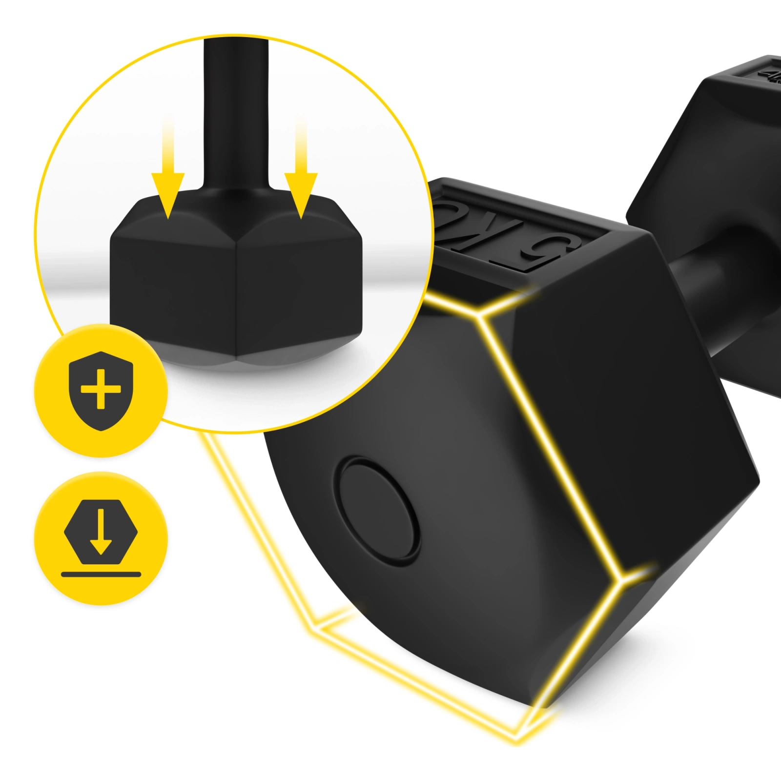 ▶️ Învelișul acestora protejează podeaua de zgârieturi, iar forma hexagonală previne rostogolirea echipamentului pe podea, sporind siguranța în timpul antrenamentului.