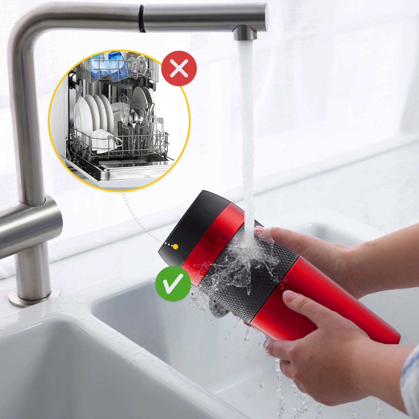 Cana termică pentru ceai și cafea MOUNTAIN GOAT TRAVEL este proiectată pentru spălare manuală. Suprafața netedă din oțel inoxidabil este ușor de păstrat curată. Dacă este necesar, poți separa cu ușurință părțile din silicon de cele din metal pentru a le spăla sau a le clăti bine.