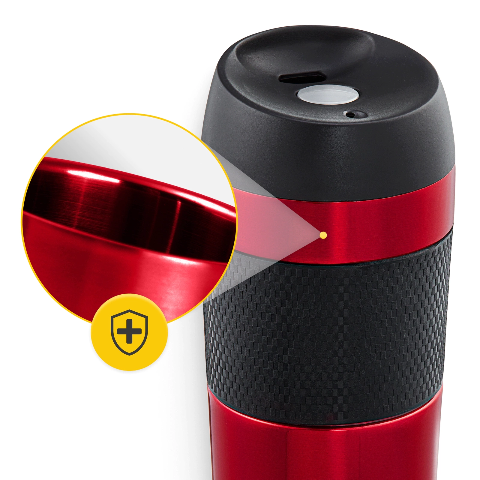 Cana termică  pentru ceai și cafea este ideală și pentru cei care lucrează de acasă. Toarnă băutura fierbinte în ea și pune-o pe birou fără griji - închiderea cu buton sigilează bine gura cănii pentru a împiedică vărsarea băuturii. Astfel, nu vei inunda computerul sau documentele.