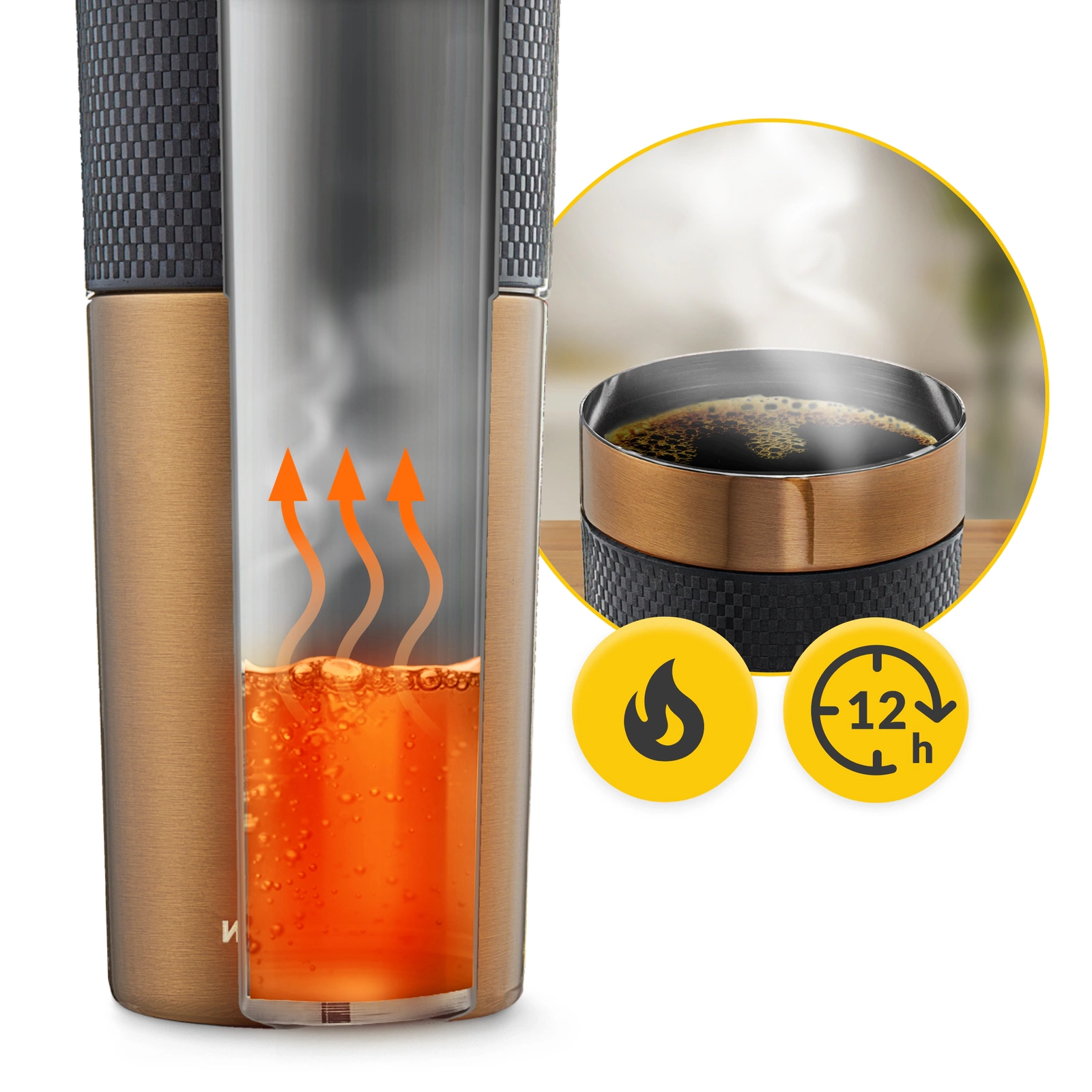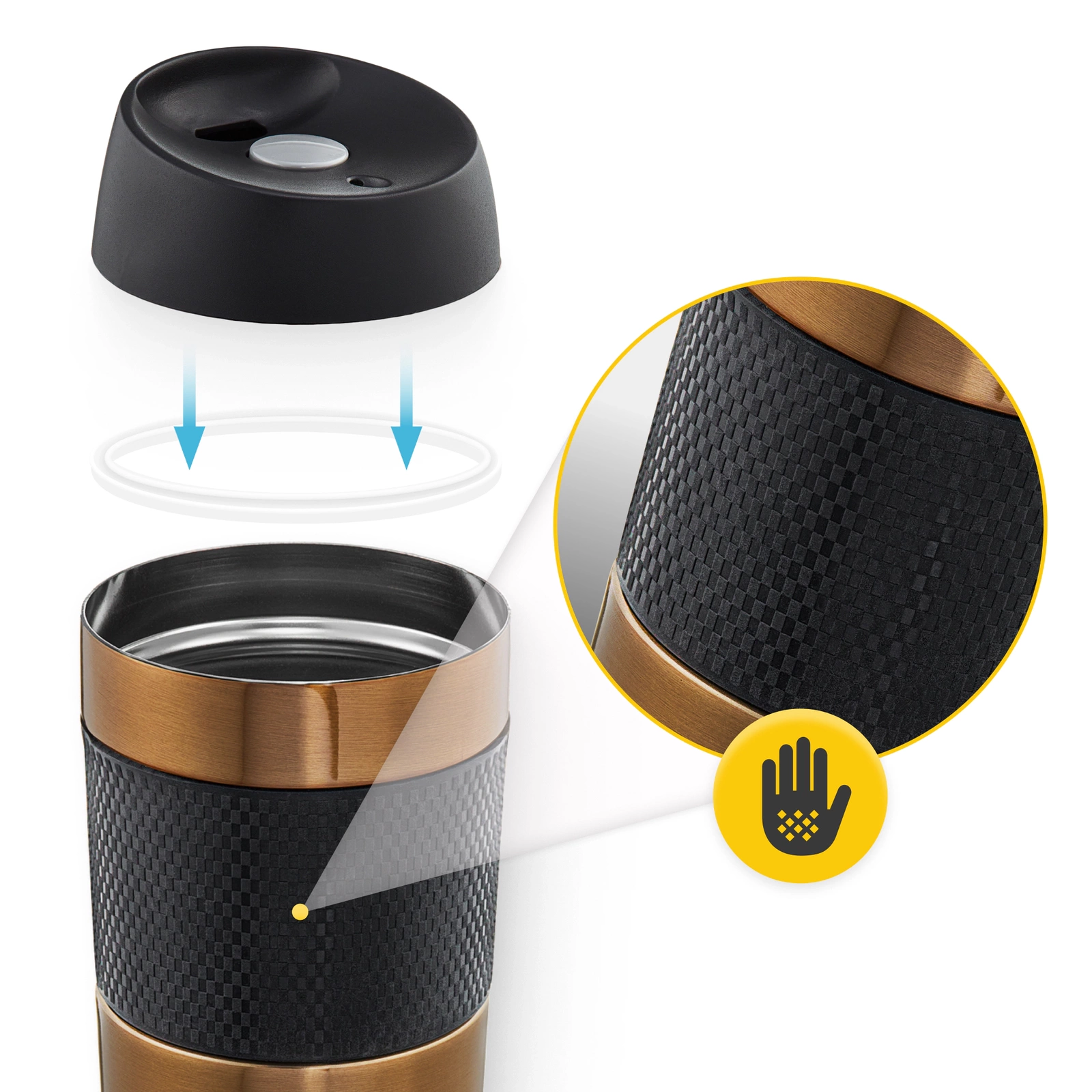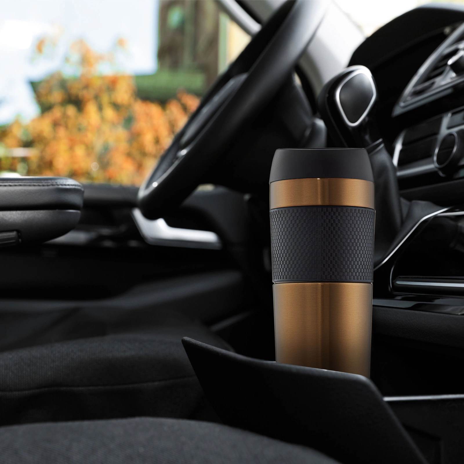 Forma ergonomică a cănii termice pentru ceai și cafea asigură o ținere confortabilă și stabilă în mână. Baza antiderapantă împiedică alunecarea. Capacitatea de 400 ml va conține aproape două cești de cafea sau ceai preferat. În plus, dimensiunea la îndemână înseamnă că ceașca nu ocupă mult spațiu. Se va potrivi cu ușurință în compartimentul ușii laterale și în mânerele mașinii.