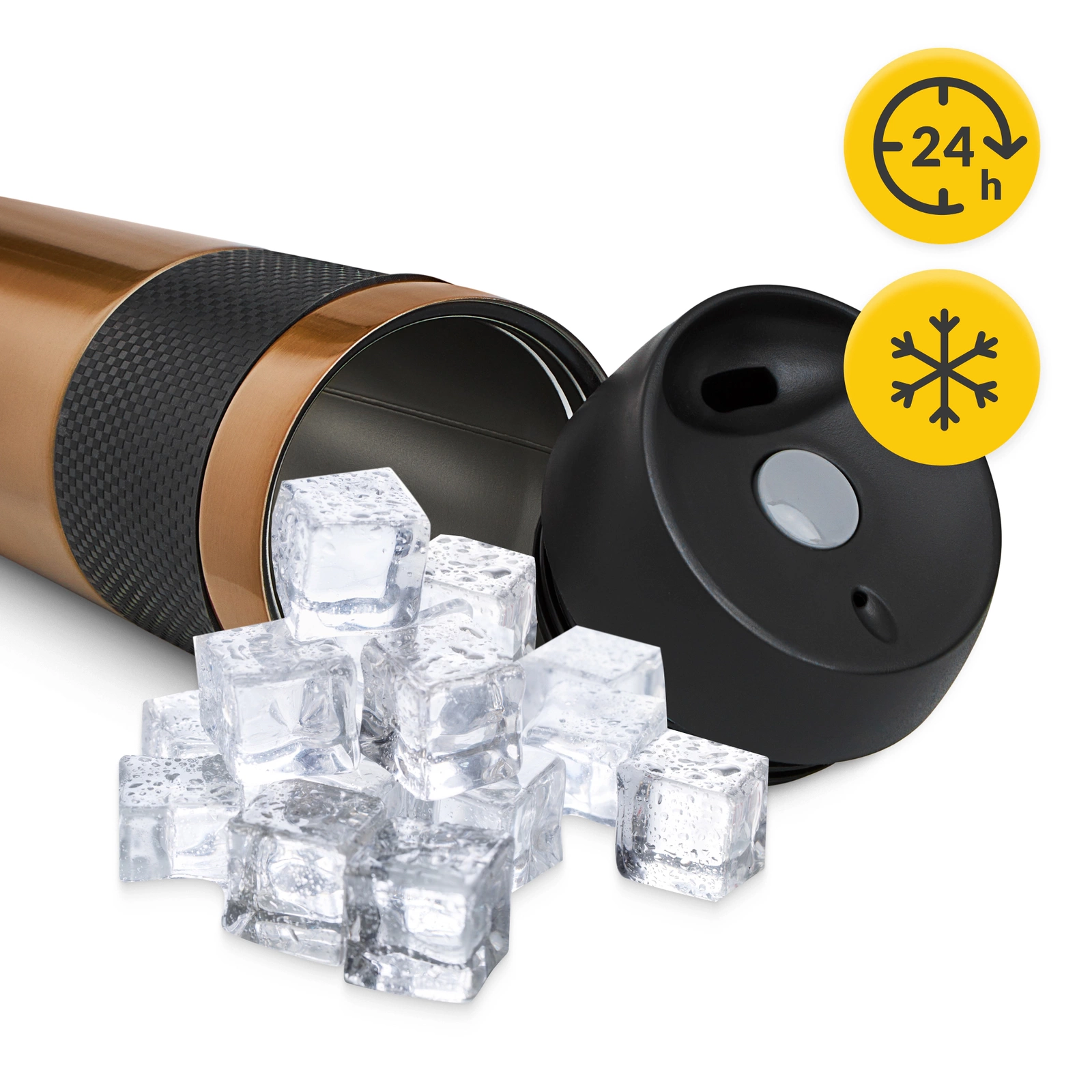 Sau îți plac băuturile bine răcite? Cana termică le păstrează reci pana la 24 de ore. O dată pentru totdeauna, uită să mai beai apă caldă atunci când călătorești, chiar și în zilele călduroase.