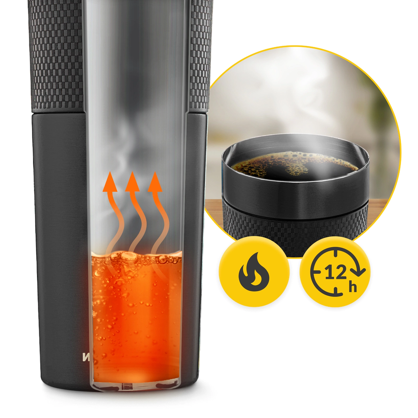 Forma ergonomică a cănii termice pentru ceai și cafea asigură o ținere confortabilă și stabilă în mână. Baza antiderapantă împiedică alunecarea. Capacitatea de 400 ml va conține aproape două cești de cafea sau ceai preferat. În plus, dimensiunea la îndemână înseamnă că ceașca nu ocupă mult spațiu. Se va potrivi cu ușurință în compartimentul ușii laterale și în mânerele mașinii.