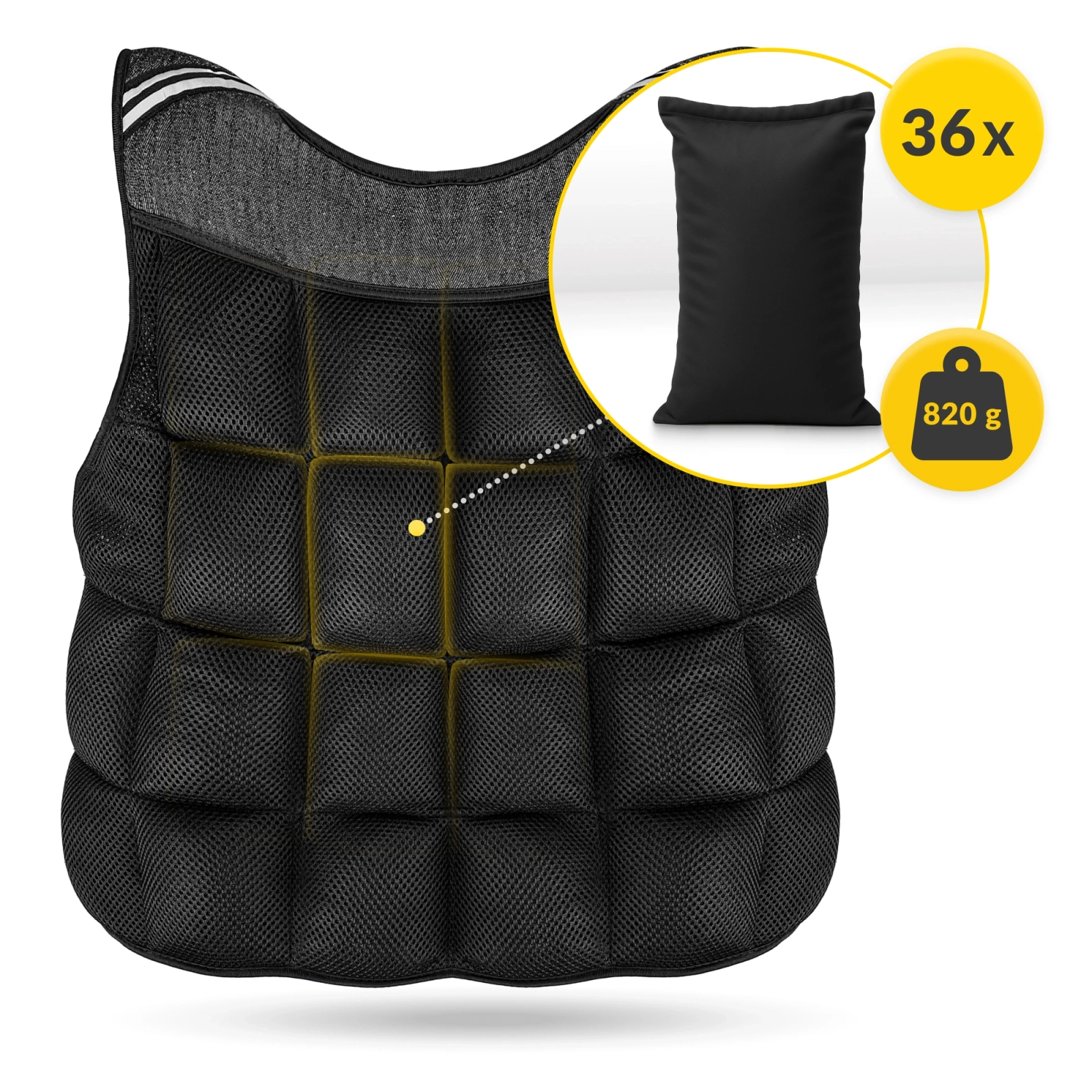 Vesta de antrenament cu greutate de 30 kg este ideală pentru persoanele care doresc să își întărească mușchii și să își îmbunătățească condiția fizică. Este, de asemenea, echipamentul sportiv potrivit pentru a te ajuta să crești intensitatea exercițiilor. În plus, purtarea unei veste cu greutăți oferă o stabilizare foarte bună, de exemplu atunci când ridici greutăți. Cu vesta cu greutăți poți efectua flotări, tracțiuni sau ridicări de greutăți. De asemenea, va funcționa bine pentru sporturile de luptă și antrenament: