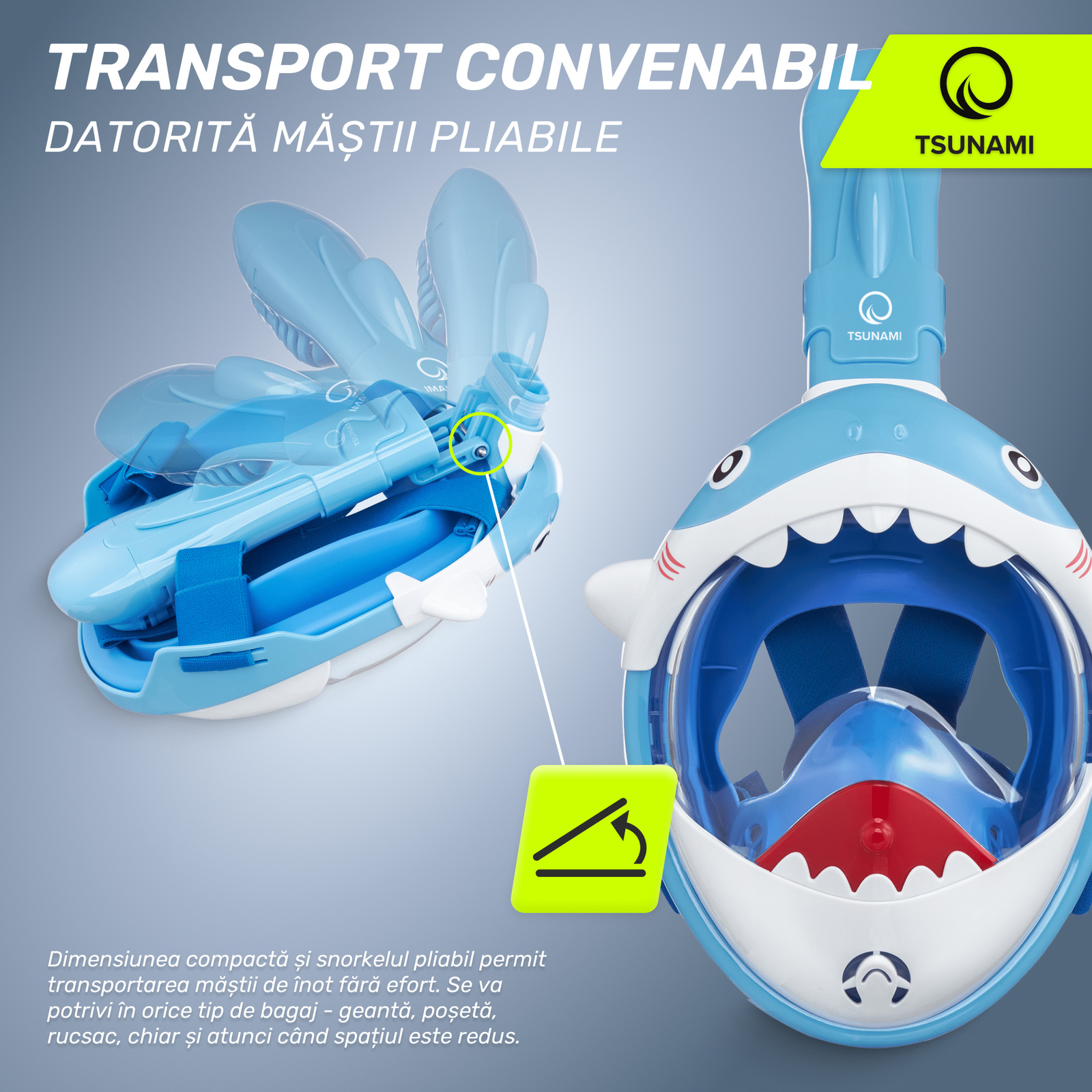 Dacă apreciați conveniența și caracterul practic, masca de scufundare integrală vă va satisface cu siguranță așteptările. Snorkelul său pliabil o face ușor de transportat, permițându-vă să depozitați masca în geantă, rucsac sau poșetă. Snorkelul pliabil reduce lungimea totală a măștii cu până la 15 cm! În plus, curelele reglabile sunt un element cheie care asigură adaptarea perfectă a măștii subacvatice la fața copilului dumneavoastră. Acestea vă permit să reglați masca pentru snorkeling, împiedicând pătrunderea apei și asigurând că masca este confortabil de purtat pentru perioade mai lungi de timp.