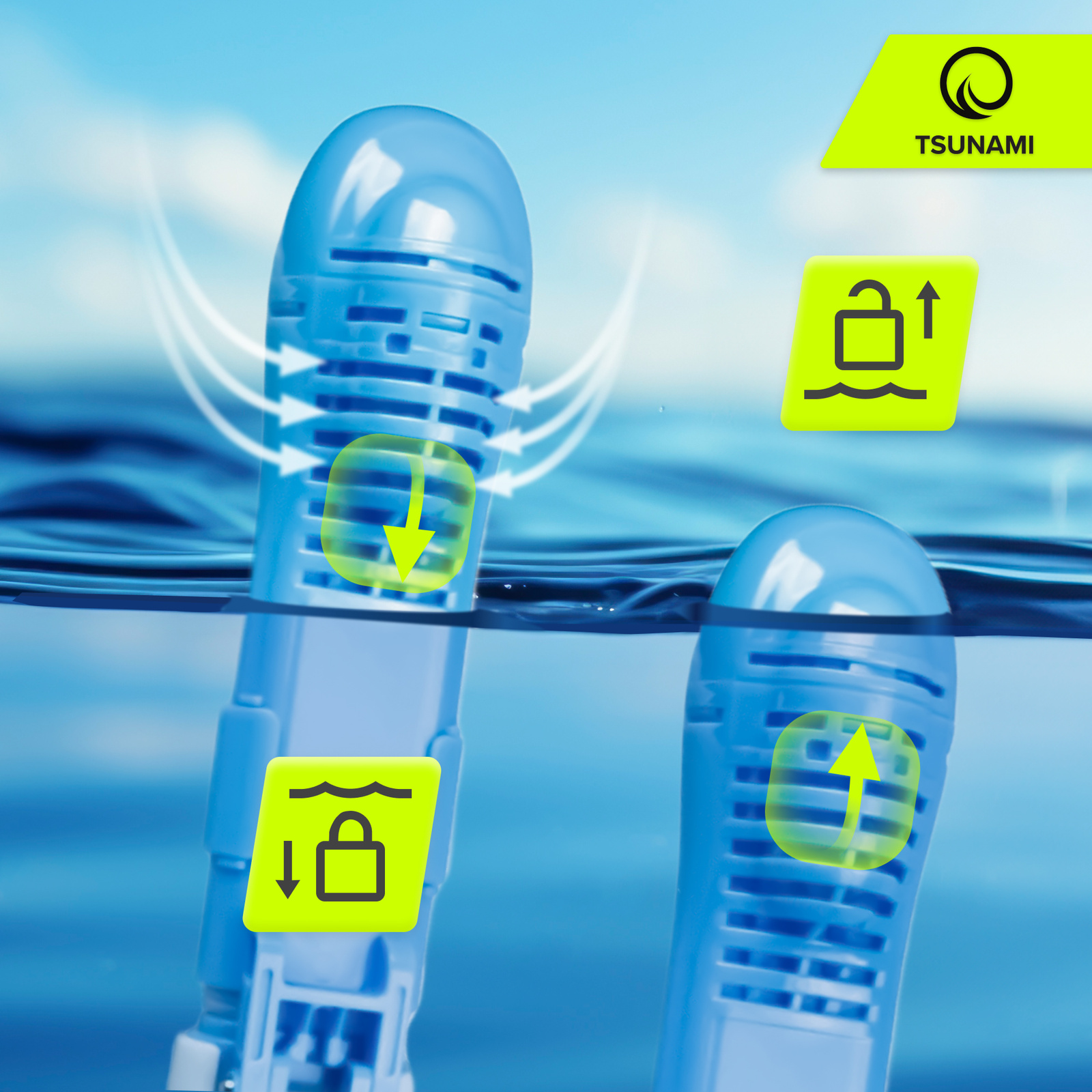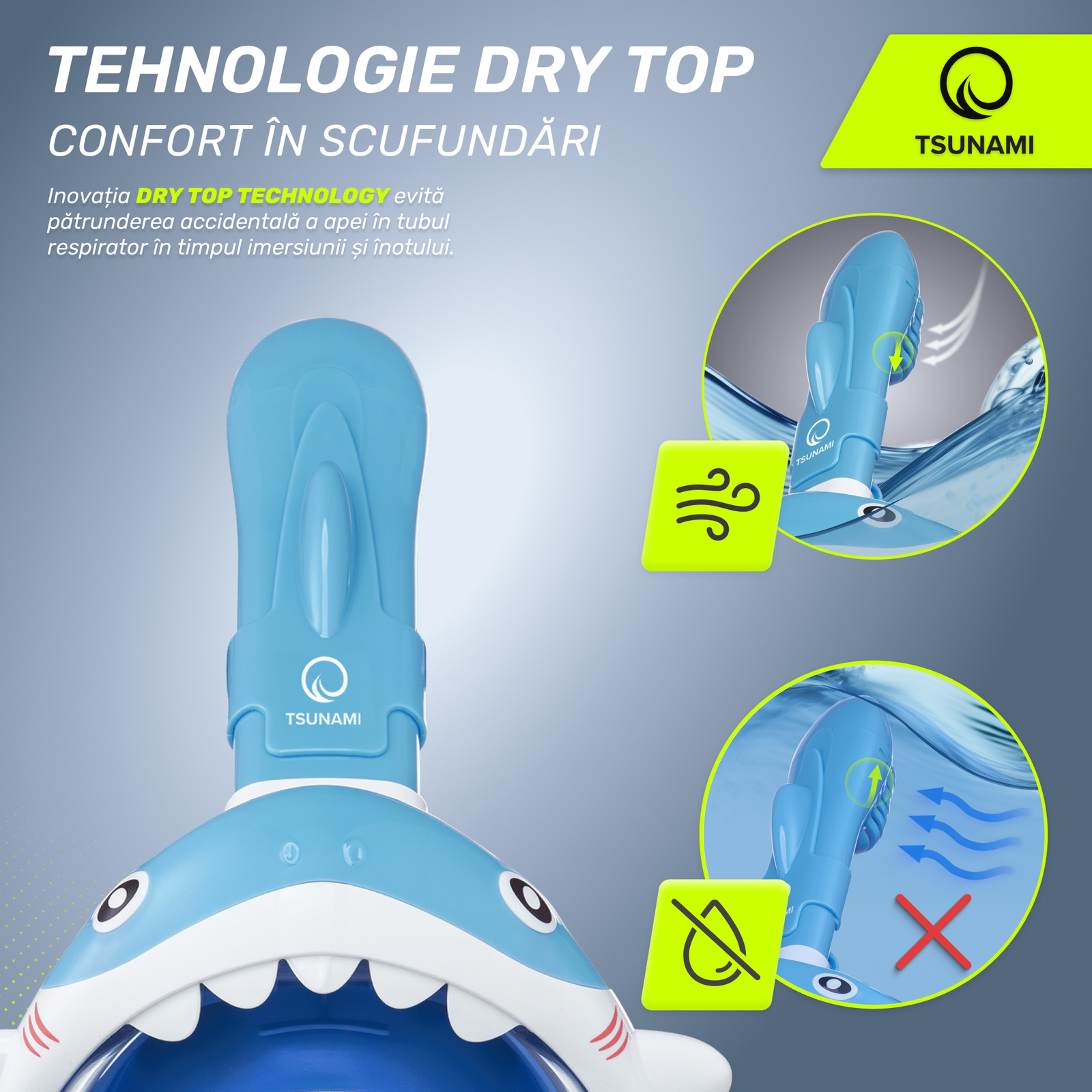 Tehnologia inovatoare DRY TOP utilizată în snorkelul măștii de scufundare împiedică în mod eficient pătrunderea apei în mască. Designul special al snorkelului, echipat cu o bilă, permite respirația liberă în timpul snorkelingului. Odată ce copilul este complet scufundat, atunci bila blochează automat deschiderea snorkelului, împiedicând pătrunderea apei. Datorită acestei soluțiiriscul de sufocare cu apăeste minim, crescând confortul și siguranța copilului dumneavoastră la scufundări.