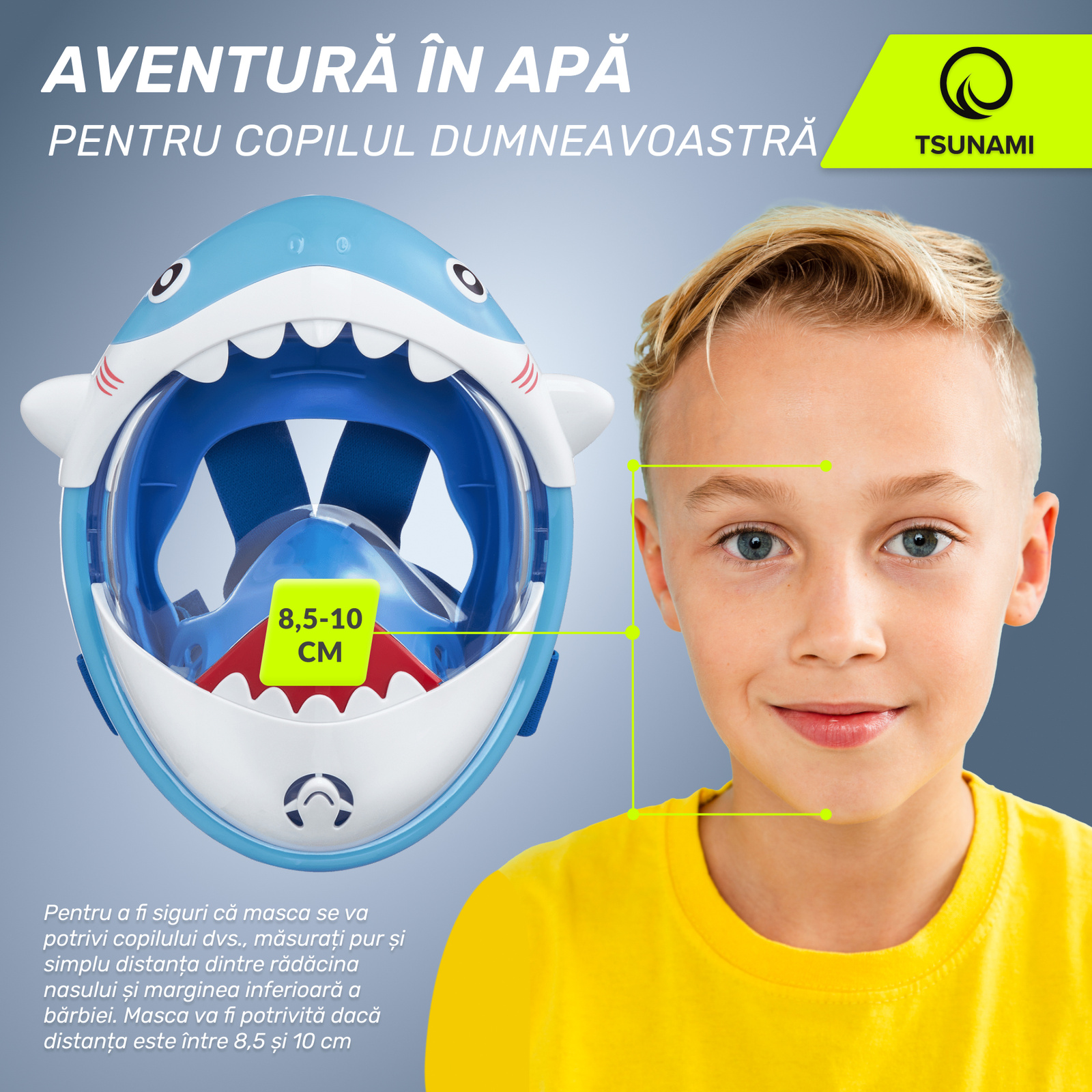 Măștile de snorkeling pentru copii TSUNAMI sunt disponibile într-o mărime universală pentru o potrivire ușoară. Pentru a vă asigura că masca se va potrivi copilului dumneavoastră, măsurați pur și simplu distanța dintre sprâncene și marginea inferioară a bărbiei. Dacă măsurarea se încadrează între 8,5 și 10 cm, aceasta înseamnă că masca se va potrivi perfect pe față, asigurând confort și siguranță în timpul scufundărilor.